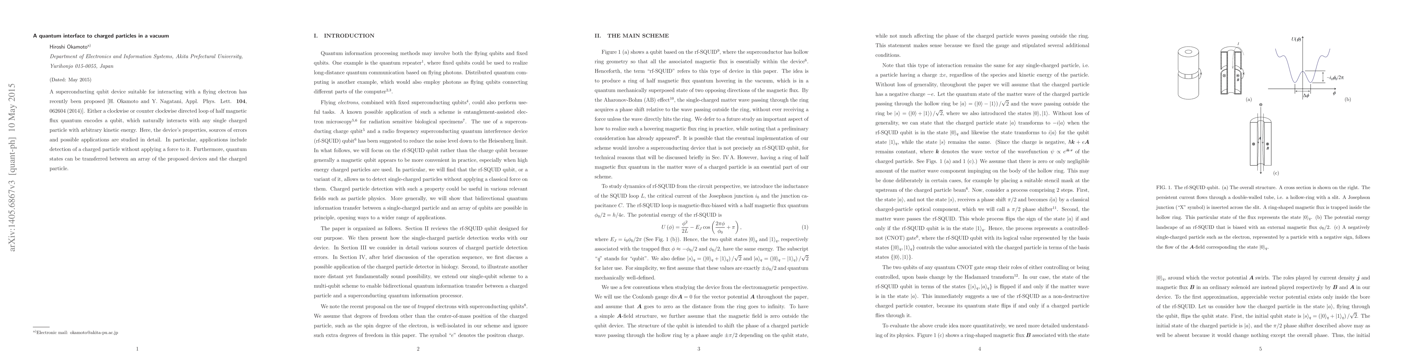A superconducting qubit device suitable for interacting with a flying electron has recently been proposed [H. Okamoto and Y. Nagatani, Appl. Phys. Lett. \textbf{104}, 062604 (2014)]. Either a clockwise or counter clockwise directed loop of half magnetic flux quantum encodes a qubit, which naturally interacts with any single charged particle with arbitrary kinetic energy. Here, the device's properties, sources of errors and possible applications are studied in detail. In particular, applications include detection of a charged particle without applying a force to it. Furthermore, quantum states can be transferred between an array of the proposed devices and the charged particle.