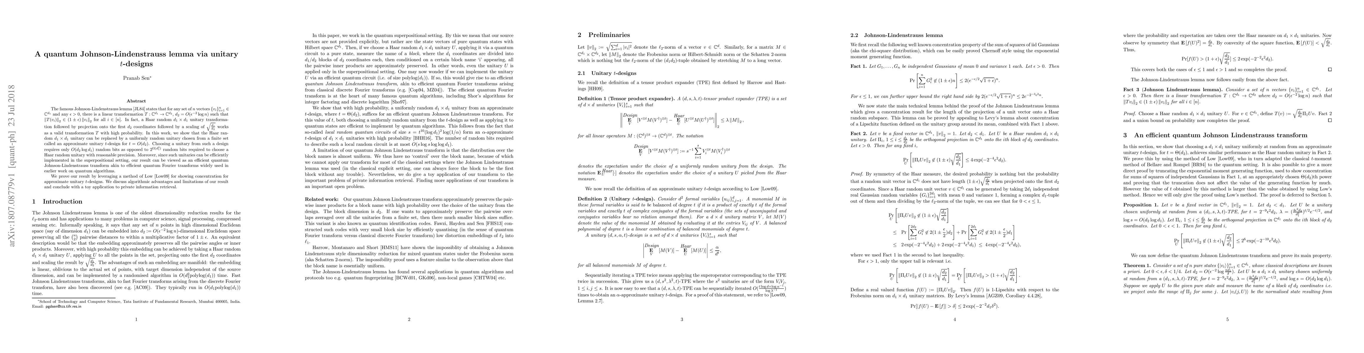 This paper proposes an efficient quantum variant of the Johnson-Lindenstrauss lemma, replacing Haar random unitaries with approximate unitary t-designs that require fewer random bits and are implementable in quantum superpositions. The method leverages concentration results for these designs and demonstrates its algorithmic advantages and a practical application in private information retrieval.