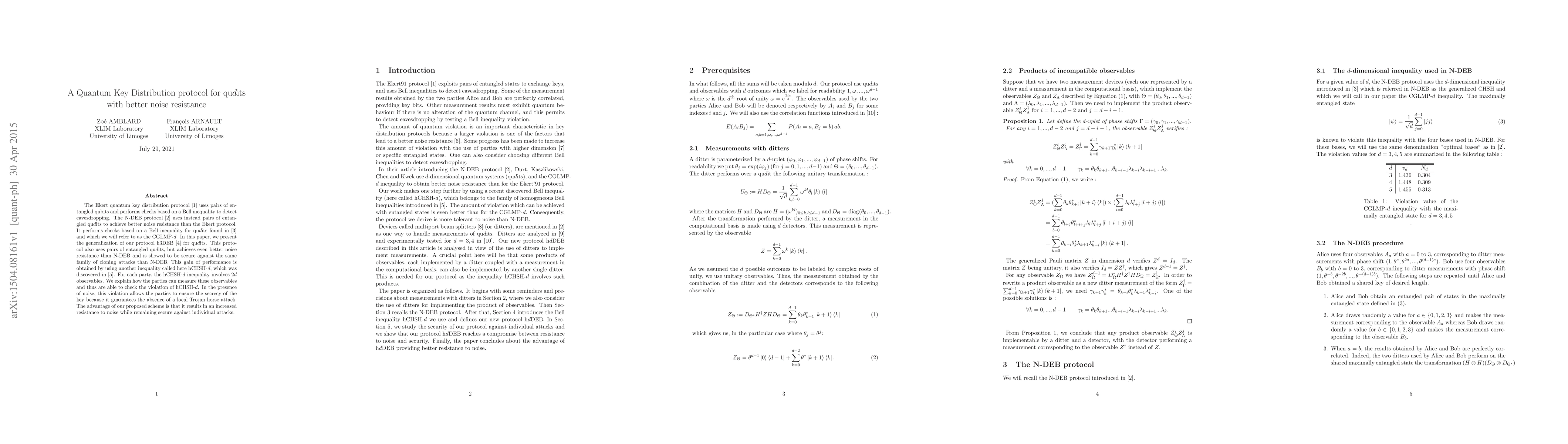 The paper introduces an improved quantum key distribution protocol (hdDEB) using a novel homogeneous Bell inequality (hCHSH-d) that offers better noise resistance compared to existing protocols like N-DEB.