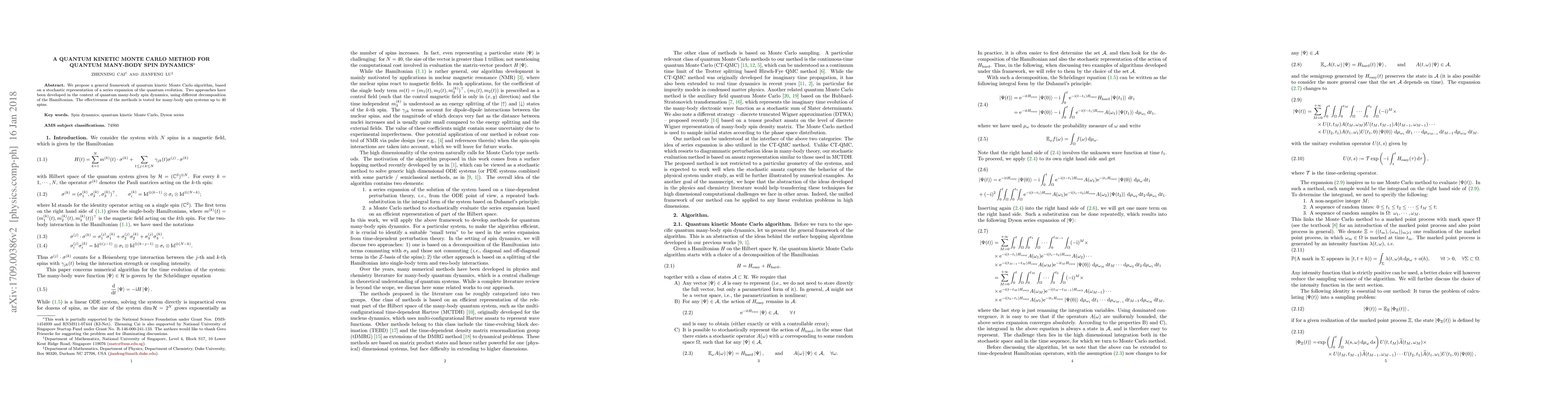 This paper introduces a quantum kinetic Monte Carlo method for simulating quantum many-body spin dynamics, employing stochastic techniques to represent quantum evolution. The effectiveness of the proposed framework is demonstrated through simulations of spin systems with up to 40 spins.
