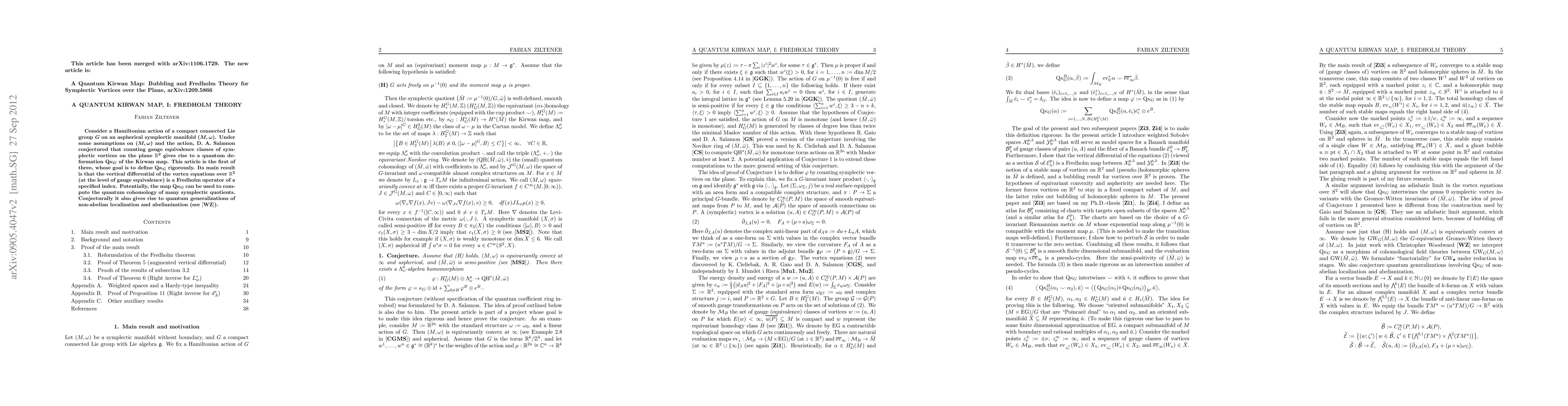 Consider a Hamiltonian action of a compact connected Lie group $G$ on an aspherical symplectic manifold $(M,\omega)$. Under some assumptions on $(M,\omega)$ and the action, D. A. Salamon conjectured that counting gauge equivalence classes of symplectic vortices on the plane $R^2$ gives rise to a quantum deformation $Q\kappa_G$ of the Kirwan map. This article is the first of three, whose goal is to define $Q\kappa_G$ rigorously. Its main result is that the vertical differential of the vortex equations over $R^2$ (at the level of gauge equivalence) is a Fredholm operator of a specified index. Potentially, the map $Q\kappa_G$ can be used to compute the quantum cohomology of many symplectic quotients. Conjecturally it also gives rise to quantum generalizations of non-abelian localization and abelianization (see [Woodward-Ziltener]).