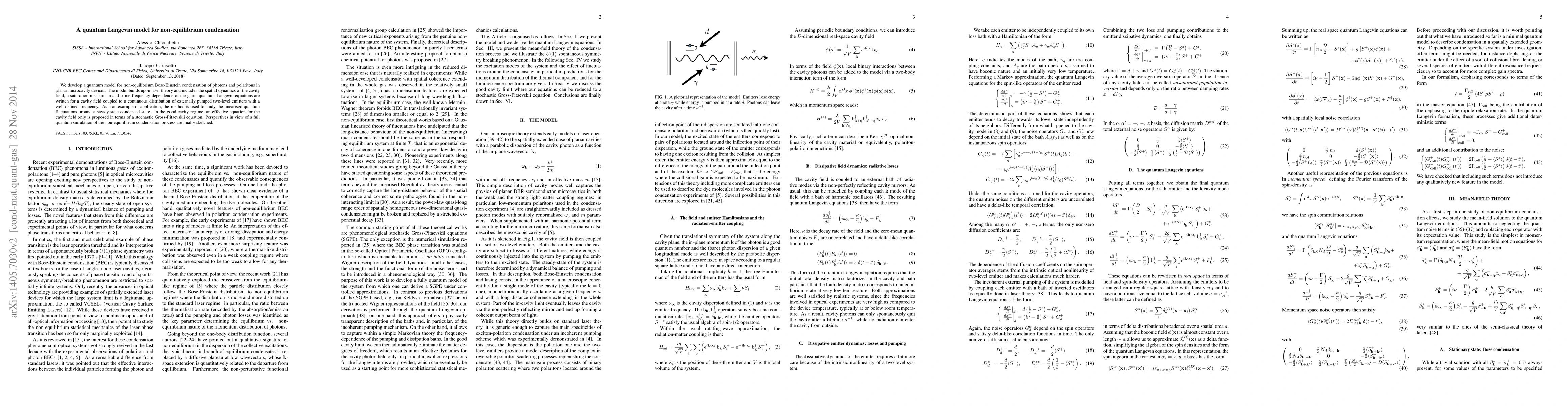 This paper develops a quantum Langevin model for non-equilibrium Bose-Einstein condensation in microcavity systems, incorporating spatial dynamics and saturation mechanisms. It proposes a stochastic Gross-Pitaevskii equation for the cavity field and explores linearized quantum fluctuations around a steady-state condensed state.