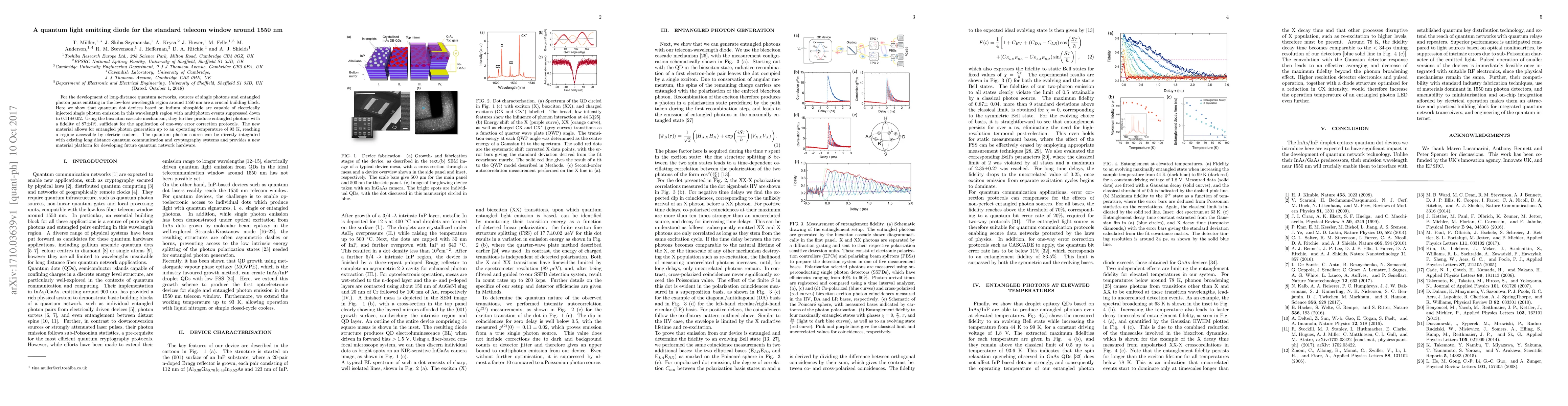 The paper presents a quantum light emitting diode based on indium phosphide quantum dots capable of electrically injected single photon emission around 1550 nm, achieving a low multiphoton event rate and entangled photon generation with high fidelity, suitable for long-distance quantum networks.