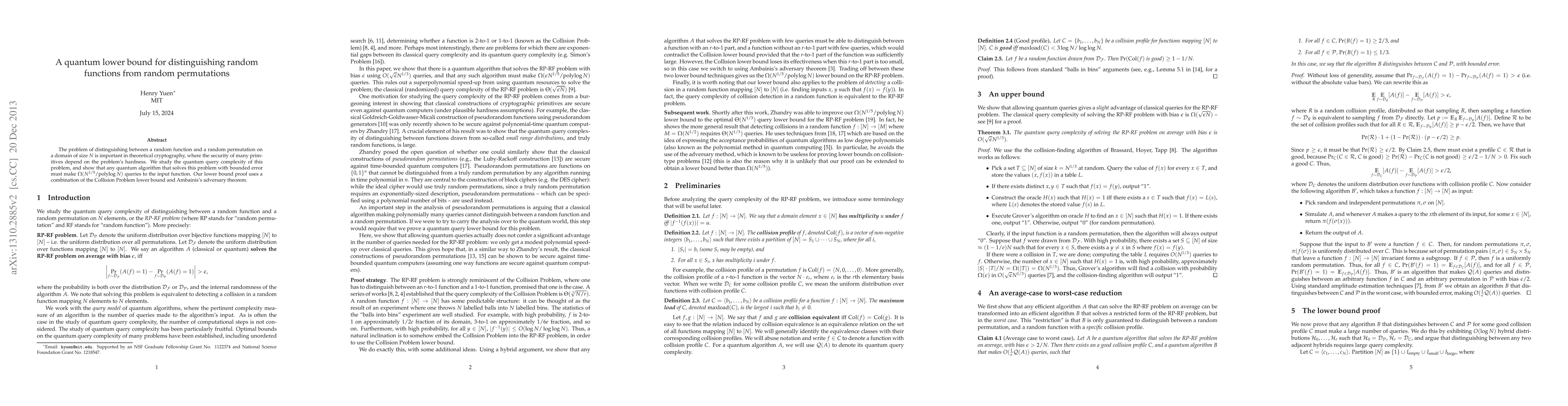 The problem of distinguishing between a random function and a random permutation on a domain of size $N$ is important in theoretical cryptography, where the security of many primitives depend on the problem's hardness. We study the quantum query complexity of this problem, and show that any quantum algorithm that solves this problem with bounded error must make $\Omega(N^{1/5}/\log N)$ queries to the input function. Our lower bound proof uses a combination of the Collision Problem lower bound and Ambainis's adversary theorem.