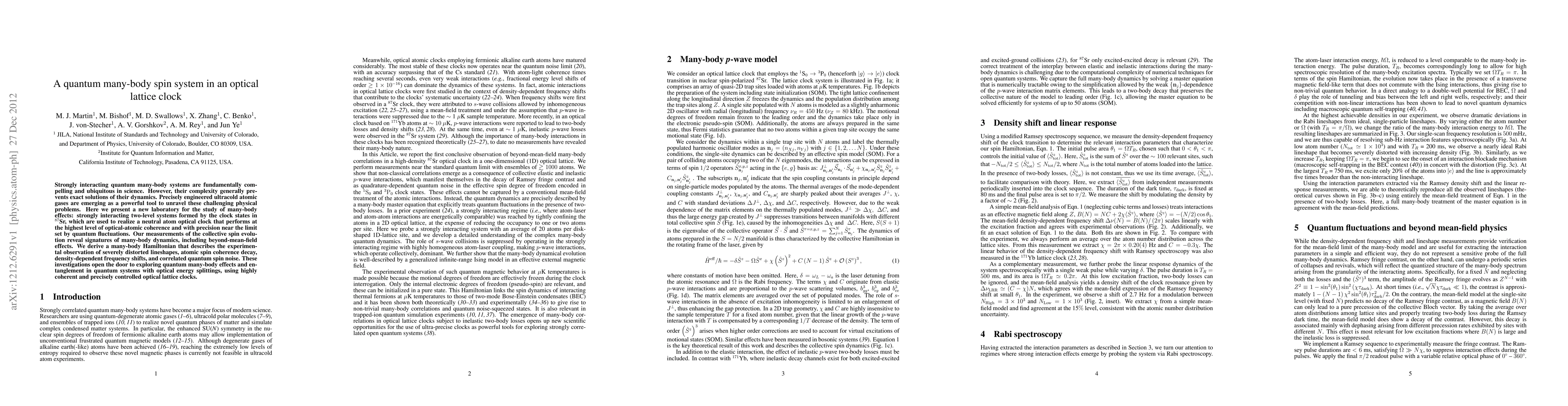 The paper presents a new laboratory setup for studying many-body effects using an optical lattice clock, along with a derived many-body Hamiltonian to describe the observed phenomena.