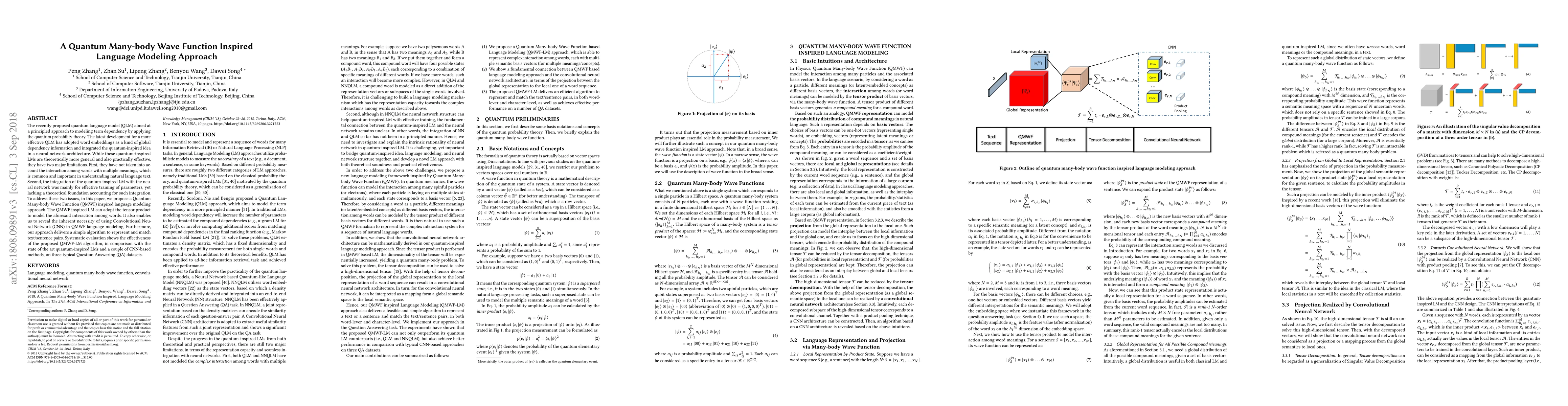 The recently proposed quantum language model (QLM) aimed at a principled approach to modeling term dependency by applying the quantum probability theory. The latest development for a more effective QLM has adopted word embeddings as a kind of global dependency information and integrated the quantum-inspired idea in a neural network architecture. While these quantum-inspired LMs are theoretically more general and also practically effective, they have two major limitations. First, they have not taken into account the interaction among words with multiple meanings, which is common and important in understanding natural language text. Second, the integration of the quantum-inspired LM with the neural network was mainly for effective training of parameters, yet lacking a theoretical foundation accounting for such integration. To address these two issues, in this paper, we propose a Quantum Many-body Wave Function (QMWF) inspired language modeling approach. The QMWF inspired LM can adopt the tensor product to model the aforesaid interaction among words. It also enables us to reveal the inherent necessity of using Convolutional Neural Network (CNN) in QMWF language modeling. Furthermore, our approach delivers a simple algorithm to represent and match text/sentence pairs. Systematic evaluation shows the effectiveness of the proposed QMWF-LM algorithm, in comparison with the state of the art quantum-inspired LMs and a couple of CNN-based methods, on three typical Question Answering (QA) datasets.