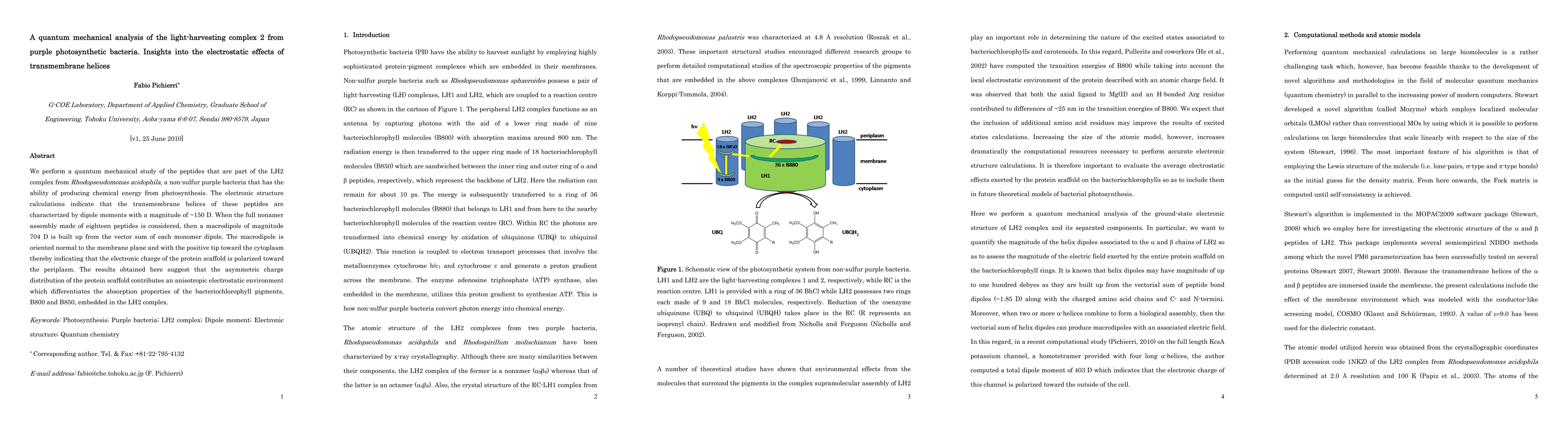 Researchers studied the light-harvesting complex 2 from purple photosynthetic bacteria using quantum mechanics, finding that its transmembrane helices create an asymmetric electrostatic environment that affects pigment absorption properties.