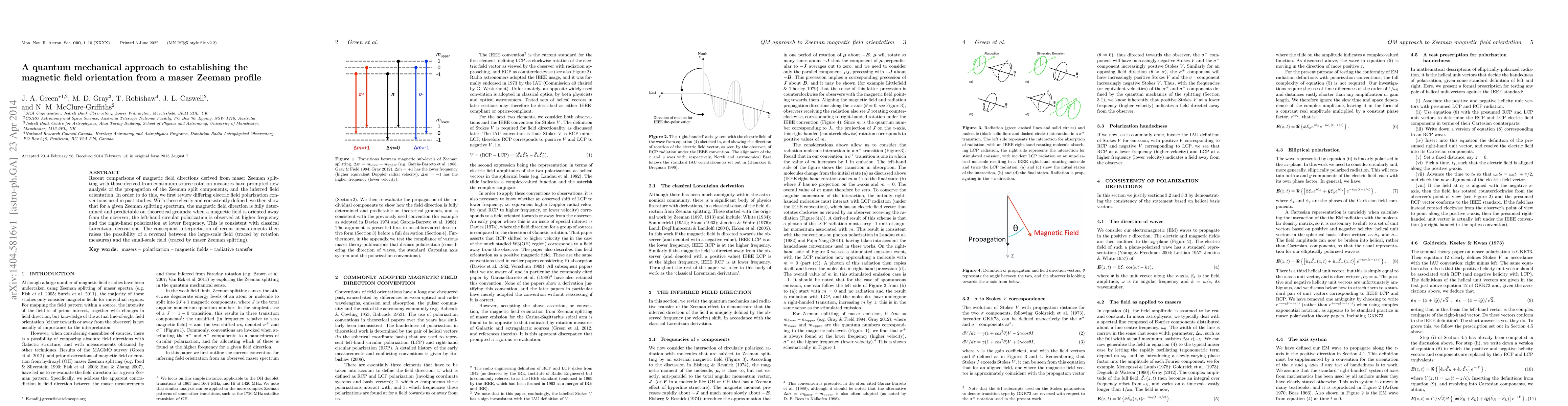 Recent comparisons of magnetic field directions derived from maser Zeeman splitting with those derived from continuum source rotation measures have prompted new analysis of the propagation of the Zeeman split components, and the inferred field orientation. In order to do this, we first review differing electric field polarization conventions used in past studies. With these clearly and consistently defined, we then show that for a given Zeeman splitting spectrum, the magnetic field direction is fully determined and predictable on theoretical grounds: when a magnetic field is oriented away from the observer, the left-hand circular polarization is observed at higher frequency and the right-hand polarization at lower frequency. This is consistent with classical Lorentzian derivations. The consequent interpretation of recent measurements then raises the possibility of a reversal between the large-scale field (traced by rotation measures) and the small-scale field (traced by maser Zeeman splitting).