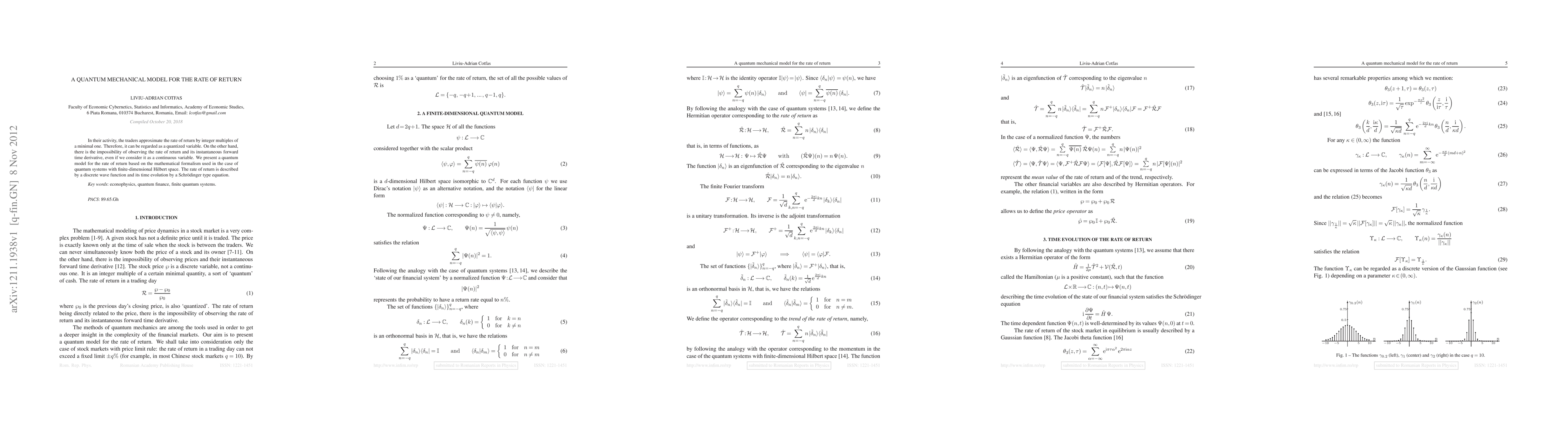 In their activity, the traders approximate the rate of return by integer multiples of a minimal one. Therefore, it can be regarded as a quantized variable. On the other hand, there is the impossibility of observing the rate of return and its instantaneous forward time derivative, even if we consider it as a continuous variable. We present a quantum model for the rate of return based on the mathematical formalism used in the case of quantum systems with finite-dimensional Hilbert space. The rate of return is described by a discrete wave function and its time evolution by a Schodinger type equation.