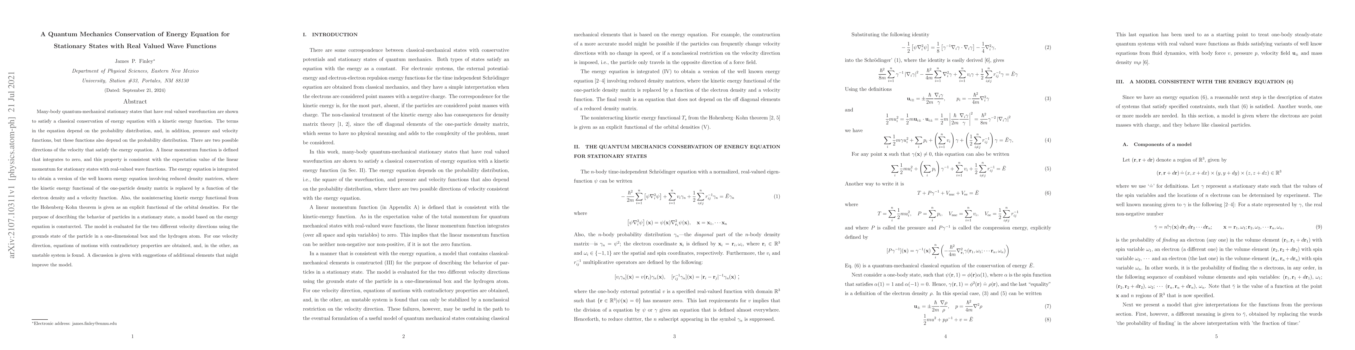 Many-body quantum-mechanical stationary states that have real valued wavefunctions are shown to satisfy a classical conservation of energy equation with a kinetic energy function. The terms in the equation depend on the probability distribution, and, in addition, pressure and velocity functions, but these functions also depend on the probability distribution. There are two possible directions of the velocity that satisfy the energy equation. A linear momentum function is defined that integrates to zero, and this property is consistent with the expectation value of the linear momentum for stationary states with real-valued wave functions. The energy equation is integrated to obtain a version of the well known energy equation involving reduced density matrices, where the kinetic energy functional of the one-particle density matrix is replaced by a function of the electron density and a velocity function. Also, the noninteracting kinetic energy functional from the Hohenberg--Kohn theorem is given as an explicit functional of the orbital densities. For the purpose of describing the behavior of particles in a stationary state, a model based on the energy equation is constructed. The model is evaluated for the two different velocity directions using the grounds state of the particle in a one-dimensional box and the hydrogen atom. For one velocity direction, equations of motions with contradictory properties are obtained, and, in the other, an unstable system is found. A discussion is given with suggestions of additional elements that might improve the model.
