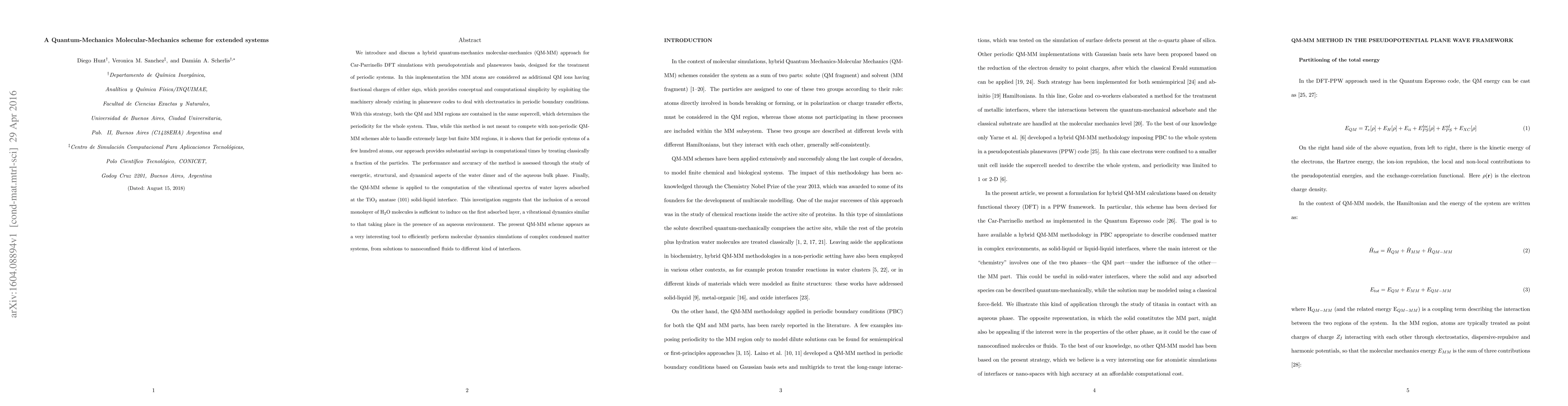 This paper presents a hybrid quantum-mechanics molecular-mechanics (QM-MM) approach for Car-Parrinello DFT simulations, designed for periodic systems. The method treats MM atoms as fractionally charged QM ions, enabling computational efficiency for systems of a few hundred atoms.