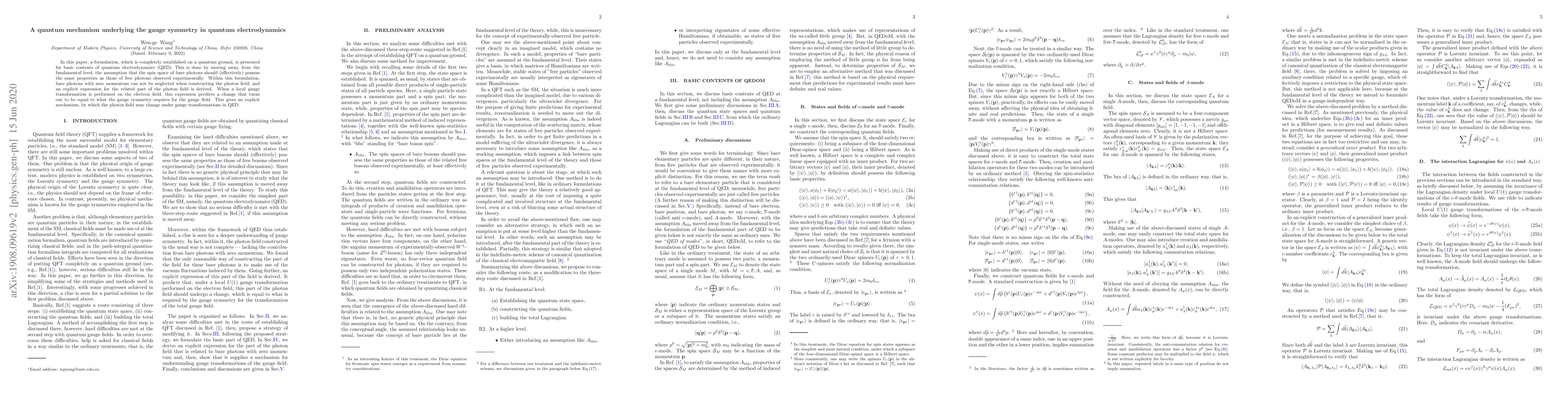 In this paper, a formulation, which is completely established on a quantum ground, is presented for basic contents of quantum electrodynamics (QED). This is done by moving away, from the fundamental level, the assumption that the spin space of bare photons should (effectively) possess the same properties as those of free photons observed experimentally. Within this formulation, bare photons with zero momentum can not be neglected when constructing the photon field; and an explicit expression for the related part of the photon field is derived. When a local gauge transformation is performed on the electron field, this expression predicts a change that turns out to be equal to what the gauge symmetry requires for the gauge field. This gives an explicit mechanism, by which the photon field may change under gauge transformations in QED.