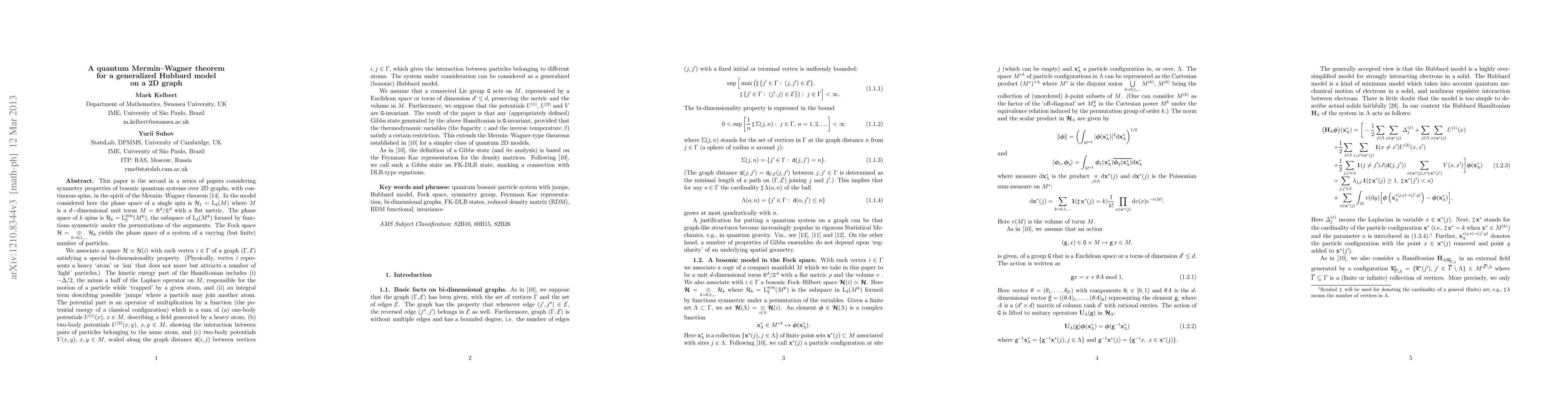 This paper is the second in a series of papers considering symmetry properties of a bosonic quantum system over an 2D graph, with continuous spins, in the spirit of the Mermin--Wagner theorem. Here we consider bosonic systems on bi-dimensional graphs where particles can jump from a vertex to another (a generalized Hubbard model). The Feynman--Kac representation is used for proving that if the local Hamiltonians are invariant under a continuous group of transformations ${\tt G}$ (a Euclidean space or a torus of dimension $d'$ acting on a torus of dimension $d\geq d'$) then any infinite-volume Gibbs state from a certain class (introduced in the paper) is also ${\tt G}$-invariant.
