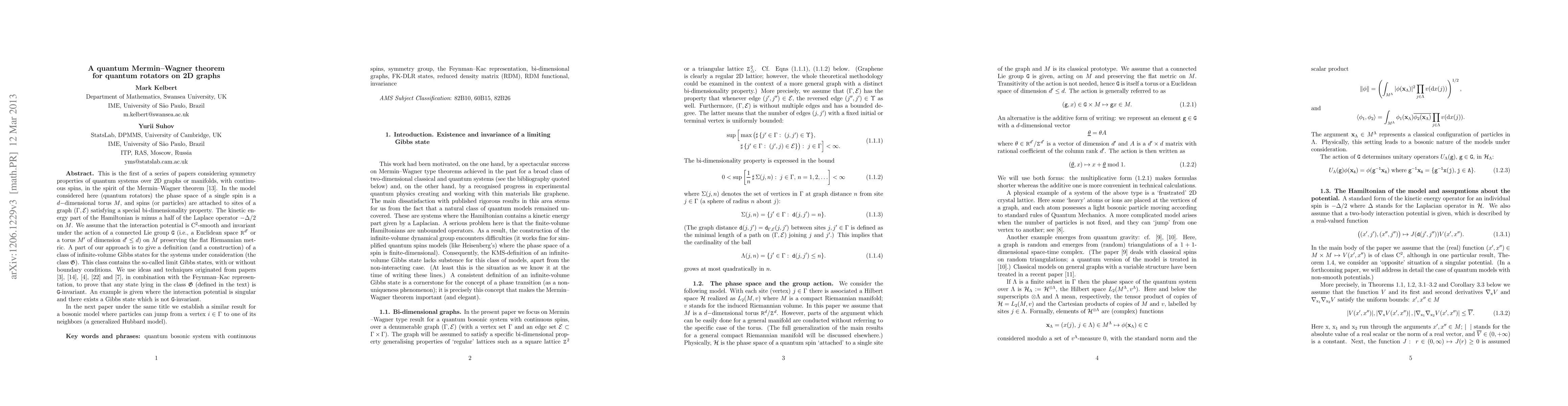 This is the first of a series of papers considering symmetry properties of quantum systems over 2D graphs or manifolds, with continuous spins, in the spirit of the Mermin--Wagner theorem. In the model considered here (quantum rotators) the phase space of a single spin is a $d-$dimensional torus, and spins (or particles) are attached to sites of a graph satisfying a special bi-dimensionality property. The kinetic energy part of the Hamiltonian is minus a half of the Laplace operator. We assume that the interaction potential is C$^2$-smooth and invariant under the action of a connected Lie group ${\ttG}$. A part of our approach is to give a definition (and a construction) of a class of infinite-volume Gibbs states for the systems under consideration (the class $\fG$). This class contains the so-called limit Gibbs states, with or without boundary conditions. We use ideas and techniques originated from various past papers, in combination with the Feynman--Kac representation, to prove that any state lying in the class $\fG$ (defined in the text) is ${\ttG}$-invariant. An example is given where the interaction potential is singular and there exists a Gibbs state which is not ${\ttG}$-invariant. In the next paper under the same title we establish a similar result for a bosonic model where particles can jump from a vertex of the graph to one of its neighbors (a generalized Hubbard model).