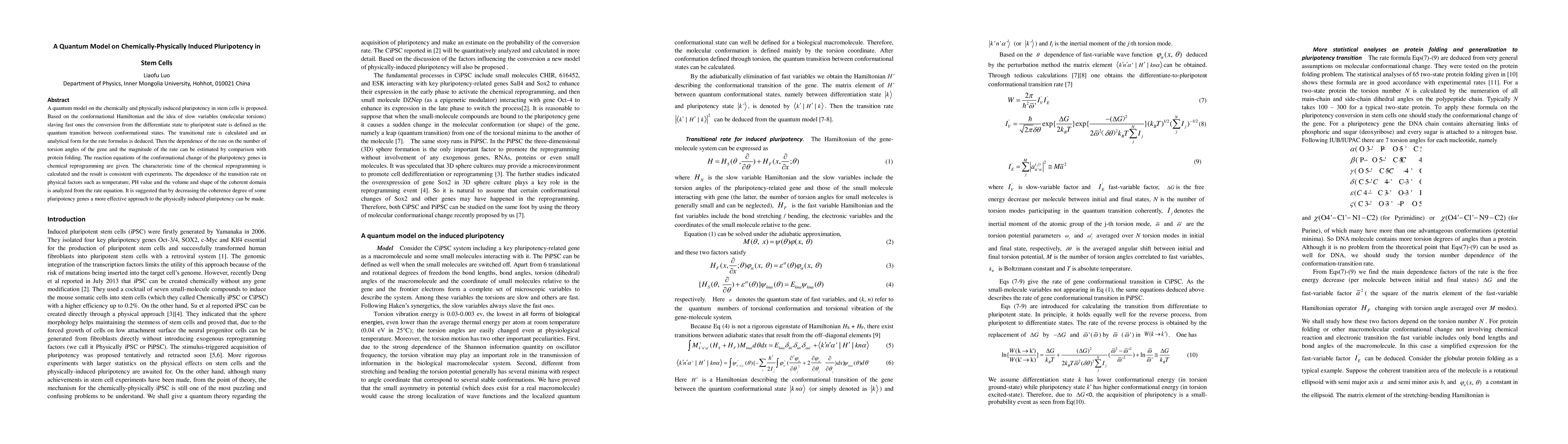 The paper proposes a quantum model for chemically and physically induced pluripotency in stem cells, defining the conversion as a quantum transition between conformational states. It calculates the transitional rate and provides reaction equations for the conformational change of pluripotency genes in chemical reprogramming, consistent with experimental results. The model also analyzes the dependence of the transition rate on physical factors, suggesting that reducing coherence degree of certain pluripotency genes could enhance physical reprogramming effectiveness.