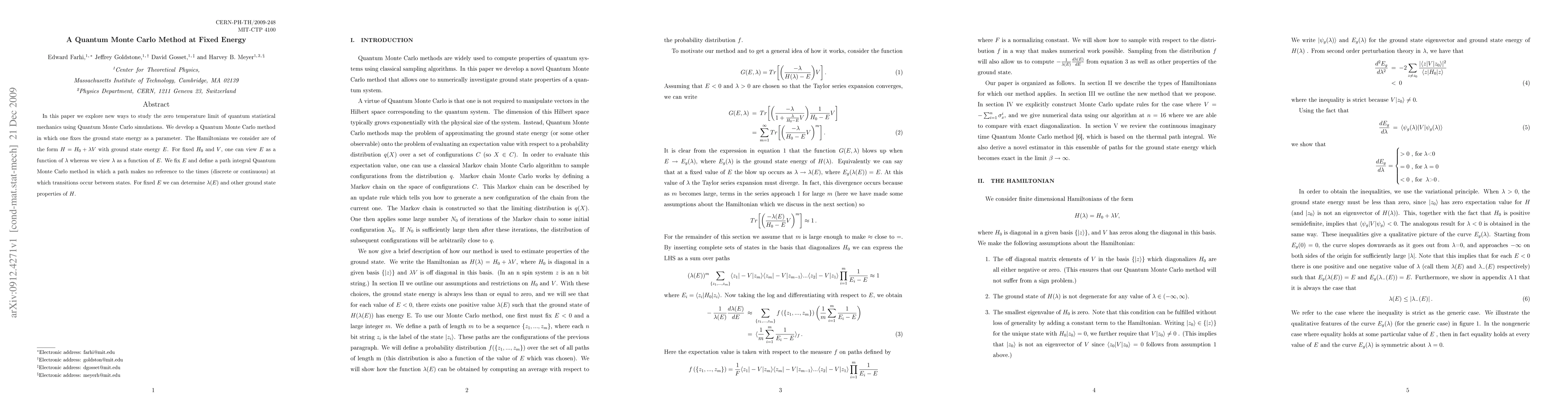 This paper introduces a novel Quantum Monte Carlo method that fixes the ground state energy to study the zero temperature limit of quantum statistical mechanics. The method allows for the determination of $\lambda(E)$ and other ground state properties by defining a path integral approach that does not reference transition times between states.