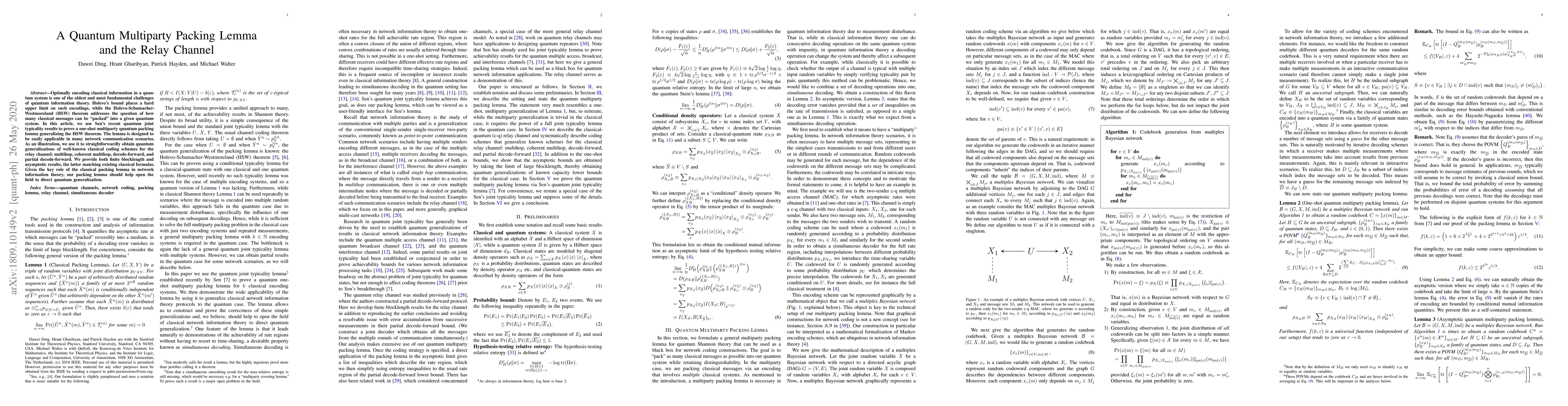 Optimally encoding classical information in a quantum system is one of the oldest and most fundamental challenges of quantum information theory. Holevo's bound places a hard upper limit on such encodings, while the Holevo-Schumacher-Westmoreland (HSW) theorem addresses the question of how many classical messages can be "packed" into a given quantum system. In this article, we use Sen's recent quantum joint typicality results to prove a one-shot multiparty quantum packing lemma generalizing the HSW theorem. The lemma is designed to be easily applicable in many network communication scenarios. As an illustration, we use it to straightforwardly obtain quantum generalizations of well-known classical coding schemes for the relay channel: multihop, coherent multihop, decode-forward, and partial decode-forward. We provide both finite blocklength and asymptotic results, the latter matching existing classical formulas. Given the key role of the classical packing lemma in network information theory, our packing lemma should help open the field to direct quantum generalization.