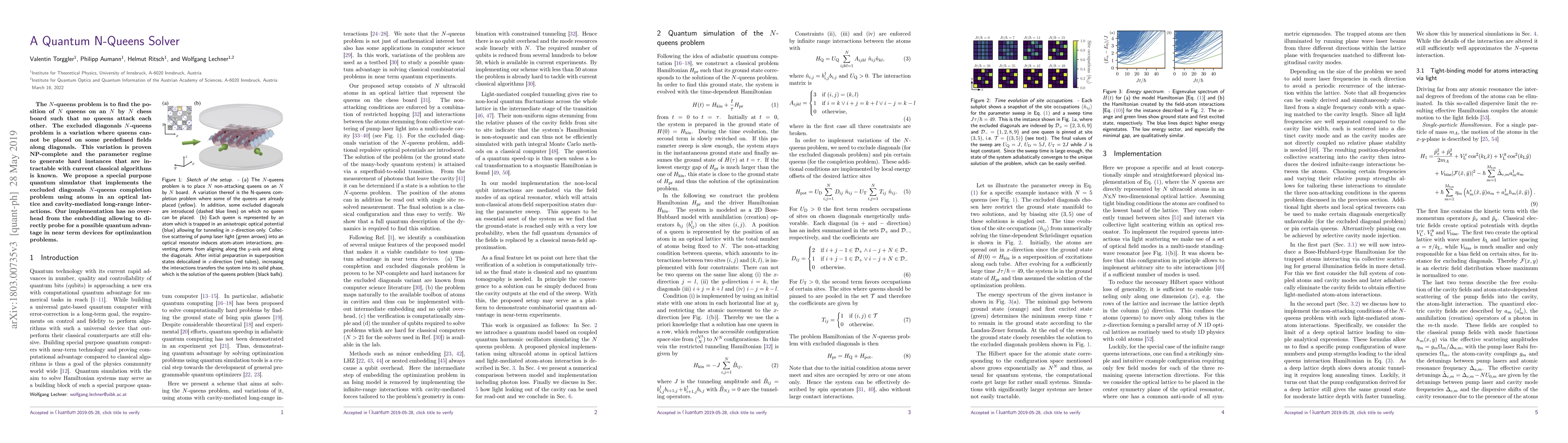 This paper proposes a quantum simulator for solving the excluded diagonals N-queens problem using atoms in an optical lattice, aiming to demonstrate a potential quantum advantage over classical algorithms for optimization problems. The approach leverages cavity-mediated long-range interactions without embedding overhead.
