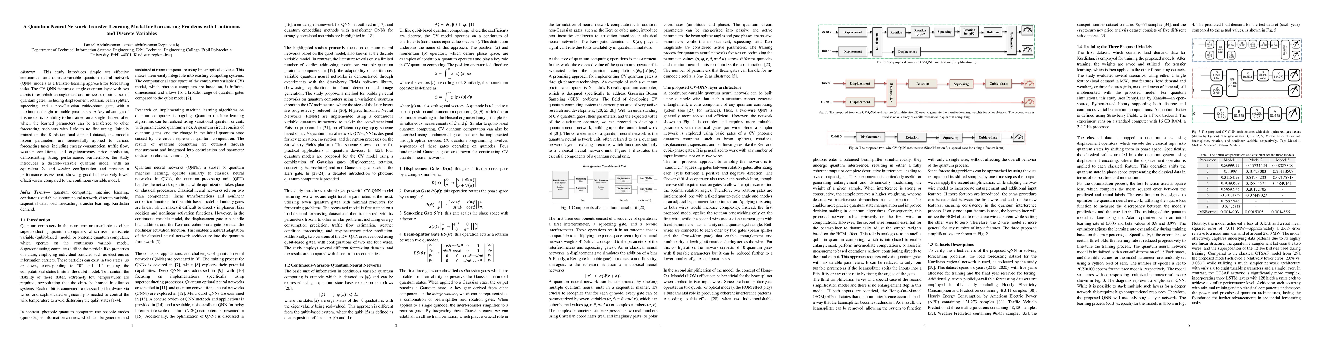 Proposes continuous-variable quantum neural network (CV-QNN) and discrete-variable quantum neural network (DV-QNN) models for transfer-learning in forecasting tasks, demonstrating their effectiveness with minimal complexity and parameters.