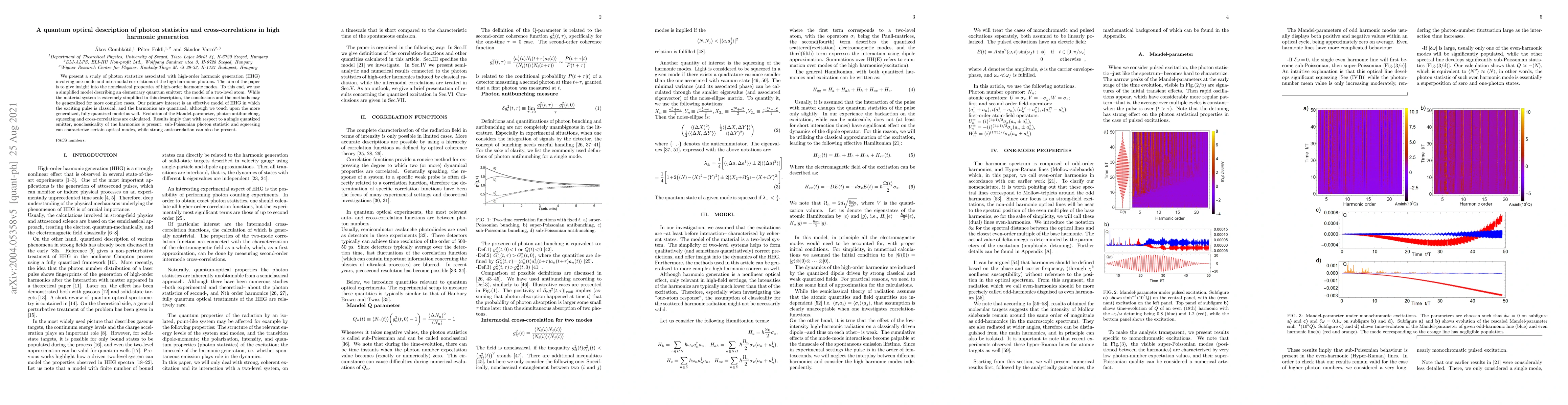 We present a study of photon statistics associated with high-order harmonic generation (HHG) involving one-mode and intermodal correlations of the high harmonic photons. The aim of the paper is to give insight into the nonclassical properties of high-order harmonic modes. To this end, we use a simplified model describing an elementary quantum emitter: the model of a two-level atom. While the material system is extremely simplified in this description, the conclusions and the methods may be generalized for more complex cases. Our primary interest is an effective model of HHG in which the exciting pulse is classical, and the harmonics are quantized, although we touch upon the more generalized, fully quantized model as well. Evolution of the Mandel-parameter, photon antibunching, squeezing and cross-correlations are calculated. Results imply that with respect to a single quantized emitter, nonclassicality of the harmonics is present: sub-Poissonian photon statistic and squeezing can characterize certain optical modes, while strong anticorrelation can also be present.