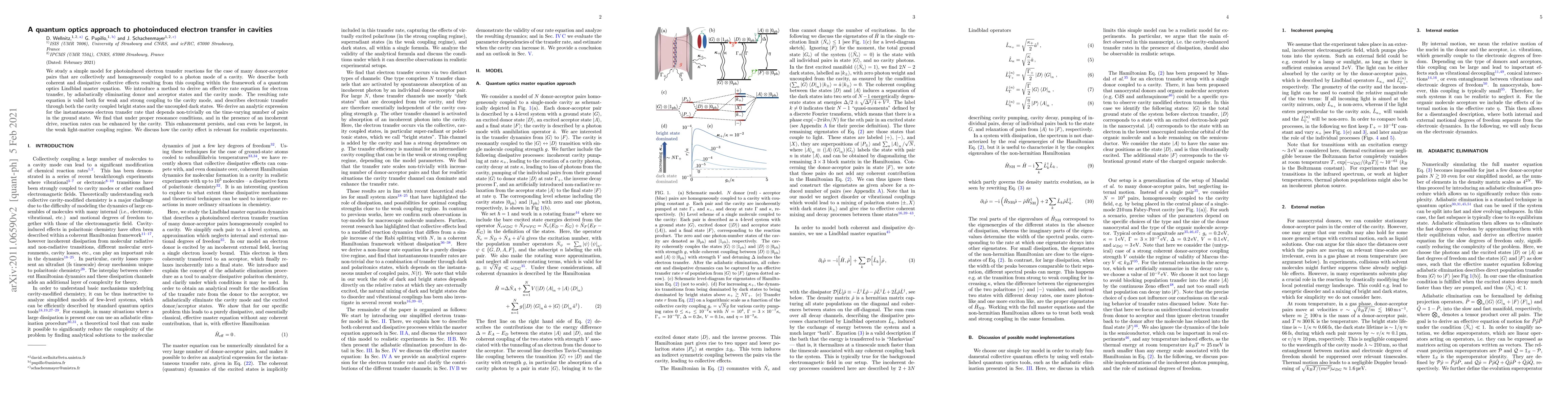 We study a simple model for photoinduced electron transfer reactions for the case of many donor-acceptor pairs that are collectively and homogeneously coupled to a photon mode of a cavity. We describe both coherent and dissipative collective effects resulting from this coupling within the framework of a quantum optics Lindblad master equation. We introduce a method to derive an effective rate equation for electron transfer, by adiabatically eliminating donor and acceptor states and the cavity mode. The resulting rate equation is valid both for weak and strong coupling to the cavity mode, and describes electronic transfer through both the cavity coupled bright states and the uncoupled dark states. We derive an analytic expression for the instantaneous electron transfer rate that depends non-trivially on the time-varying number of pairs in the ground state. We find that under proper resonance conditions, and in the presence of an incoherent drive, reaction rates can be enhanced by the cavity. This enhancement persists, and can even be largest, in the weak light-matter coupling regime. We discuss how the cavity effect is relevant for realistic experiments.