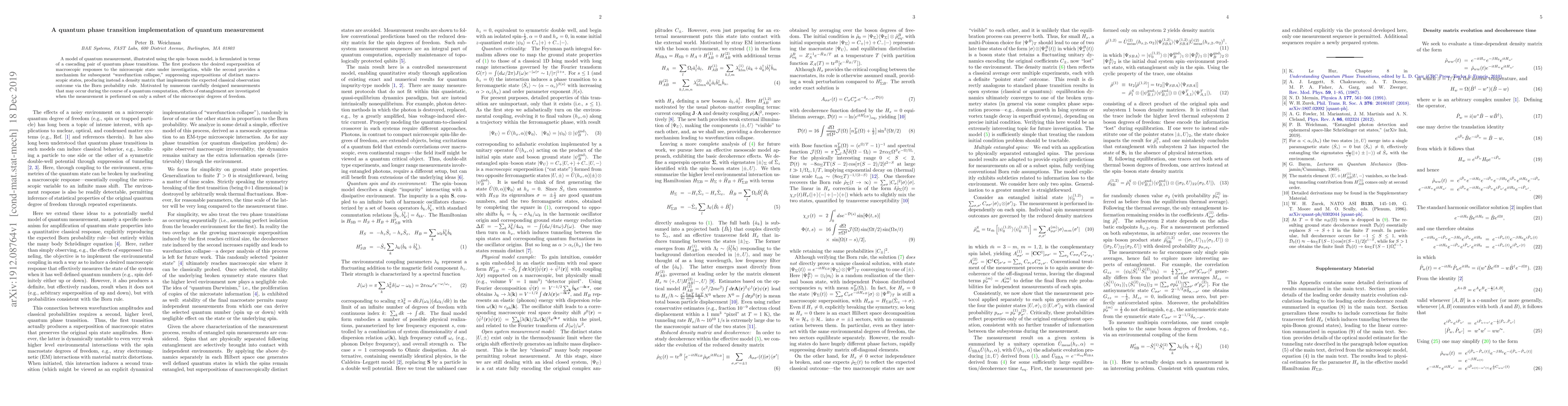 A model of quantum measurement, illustrated using the spin--boson model, is formulated in terms of a cascading pair of quantum phase transitions. The first produces the desired superposition of macroscopic responses to the microscopic state under investigation, while the second provides a mechanism for subsequent "wavefunction collapse," suppressing superpositions of distinct macroscopic states, producing instead a density matrix that implements the expected classical observation outcome via the Born probability rule. Motivated by numerous carefully designed measurements that may occur during the course of a quantum computation, effects of entanglement are investigated when the measurement is performed on only a subset of the microscopic degrees of freedom.
