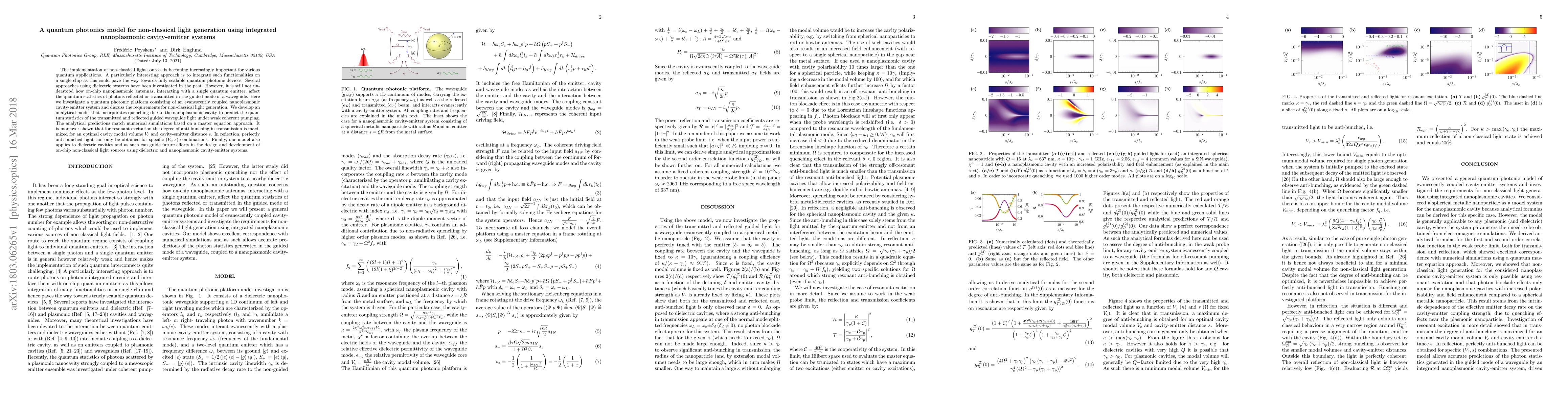 This paper develops a quantum photonics model for generating non-classical light using integrated nanoplasmonic cavity-emitter systems, showing that optimal cavity modal volume and distance maximize anti-bunching in transmission, while specific combinations achieve it in reflection. The model also extends to dielectric cavities, guiding future design of scalable quantum photonic devices.