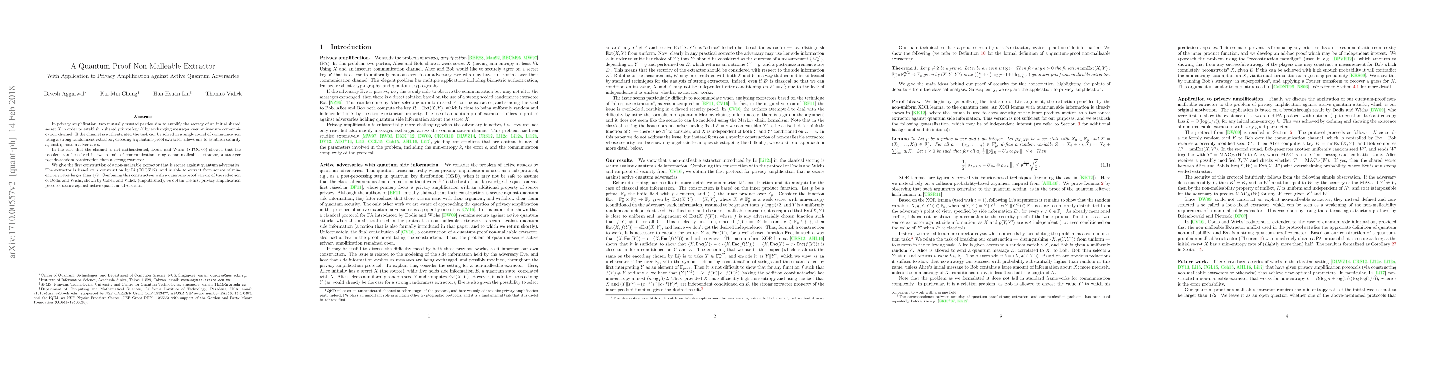 This paper constructs the first quantum-proof non-malleable extractor, enabling privacy amplification against active quantum adversaries. The extractor, based on Li's construction, can extract from sources with min-entropy rates greater than 1/2, and when combined with a quantum-proof reduction, provides a secure protocol for establishing shared private keys.