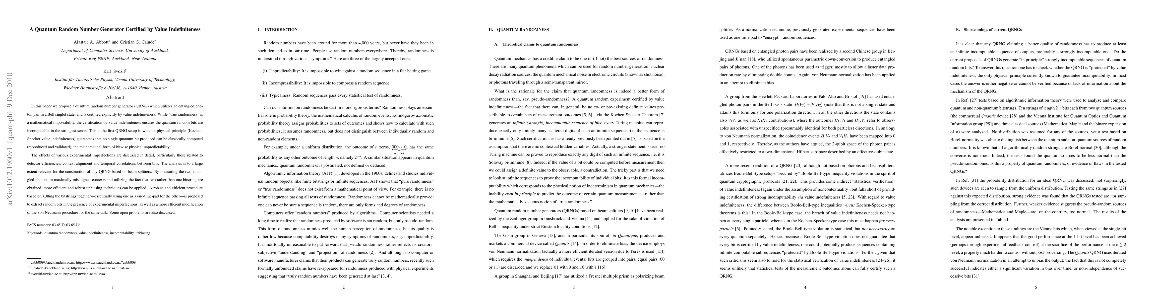 This paper introduces a quantum random number generator (QRNG) certified by value indefiniteness, ensuring the quantum random bits are incomputable. The setup uses entangled photon pairs and addresses experimental imperfections to extract robust random bits, proposing efficient unbiasing techniques.