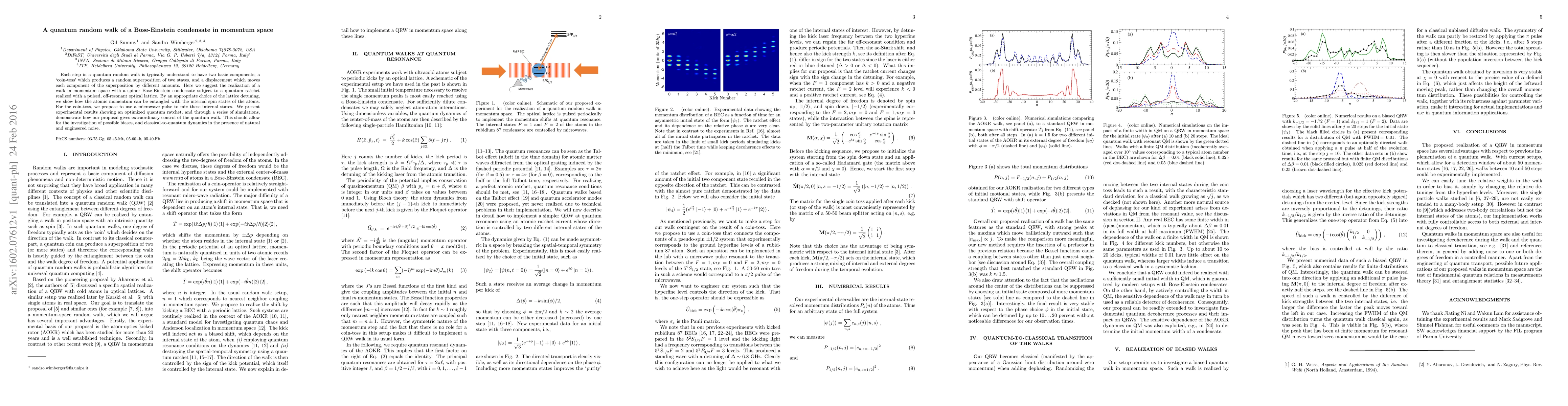 This paper proposes a quantum random walk in momentum space using a spinor Bose-Einstein condensate, employing a quantum ratchet with an off-resonant optical lattice and microwave pulses for entanglement and state mixing. Experimental results and simulations demonstrate the feasibility of this approach, offering control over quantum walk dynamics.