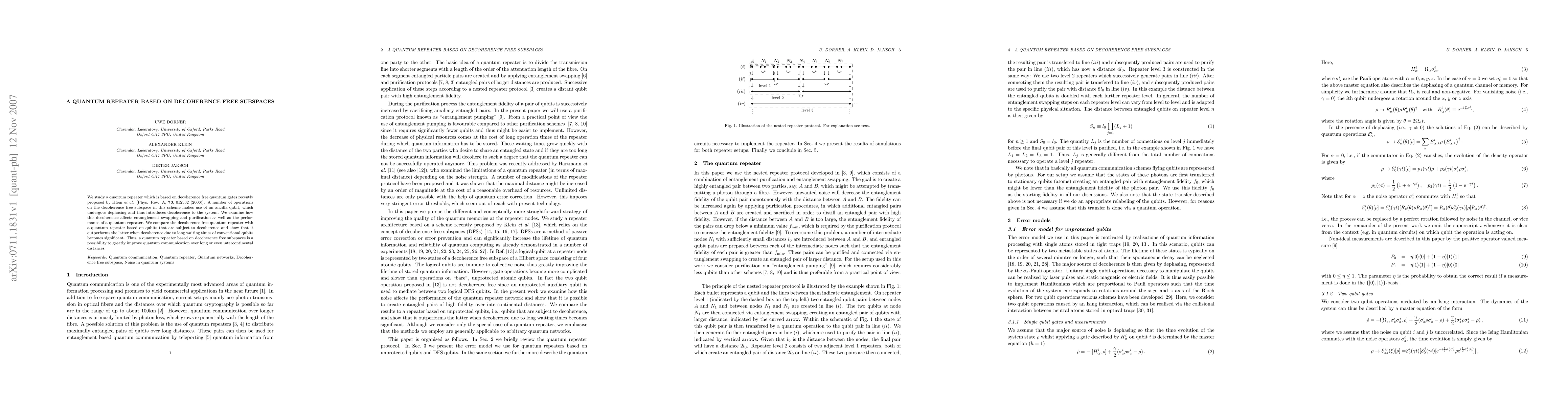 Summary: This paper investigates a quantum repeater using decoherence-free subspaces, showing it can outperform conventional repeaters in long-distance quantum communication due to reduced decoherence from long waiting times. The study highlights the impact of decoherence on entanglement swapping and purification in this scheme.
