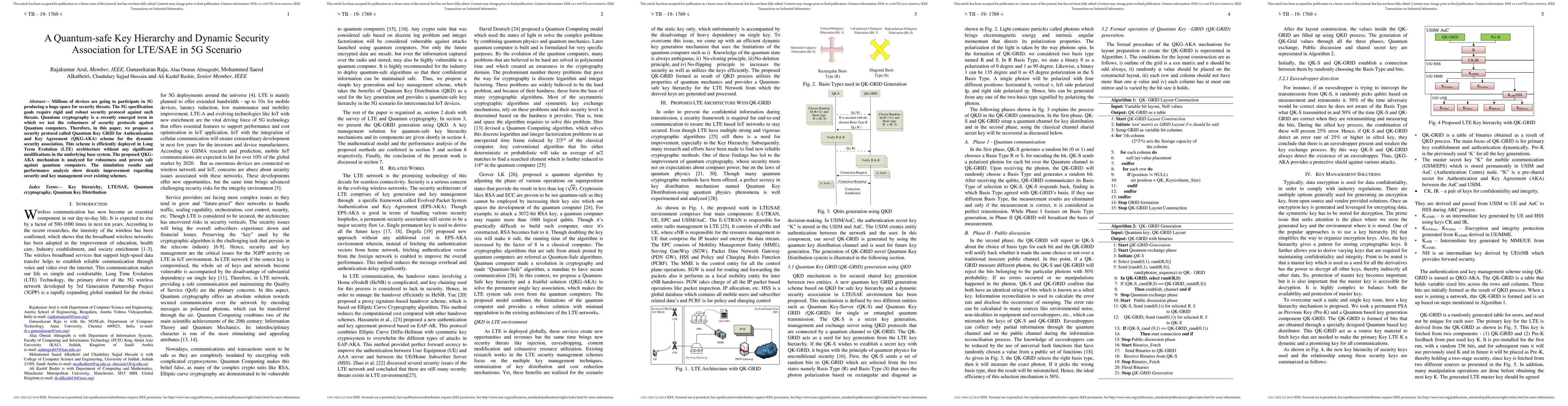 Millions of devices are going to participate in 5G producing a huge space for security threats. The 5G specification goals require rigid and robust security protocol against such threats. Quantum cryptography is a recently emerged term in which we test the robustness of security protocols against Quantum computers. Therefore, in this paper, we propose a security protocol called Quantum Key GRID for Authentication and Key Agreement (QKG-AKA) scheme for the dynamic security association. This scheme is efficiently deployed in Long Term Evolution (LTE) architecture without any significant modifications in the underlying base system. The proposed QKG-AKA mechanism is analyzed for robustness and proven safe against quantum computers. The simulation results and performance analysis show drastic improvement regarding security and key management over existing schemes.