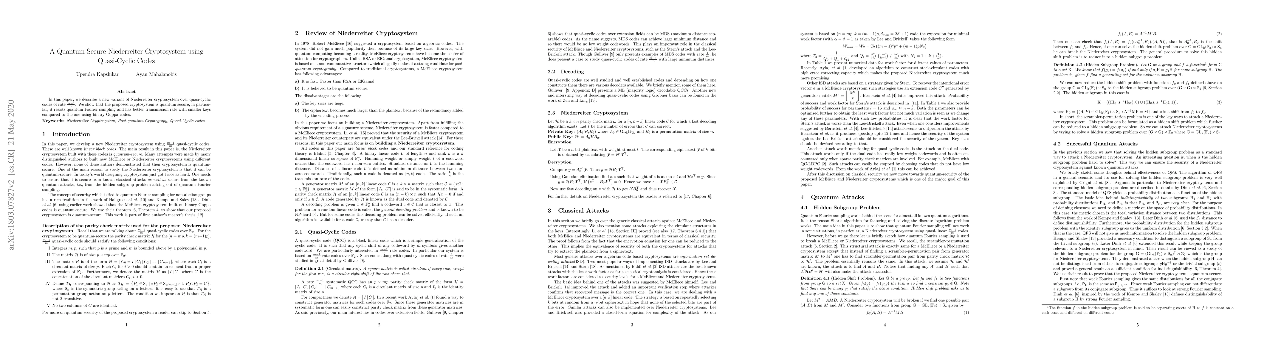This paper introduces a quantum-secure Niederreiter cryptosystem based on quasi-cyclic codes, offering a higher transmission rate and smaller keys compared to systems using binary Goppa codes.