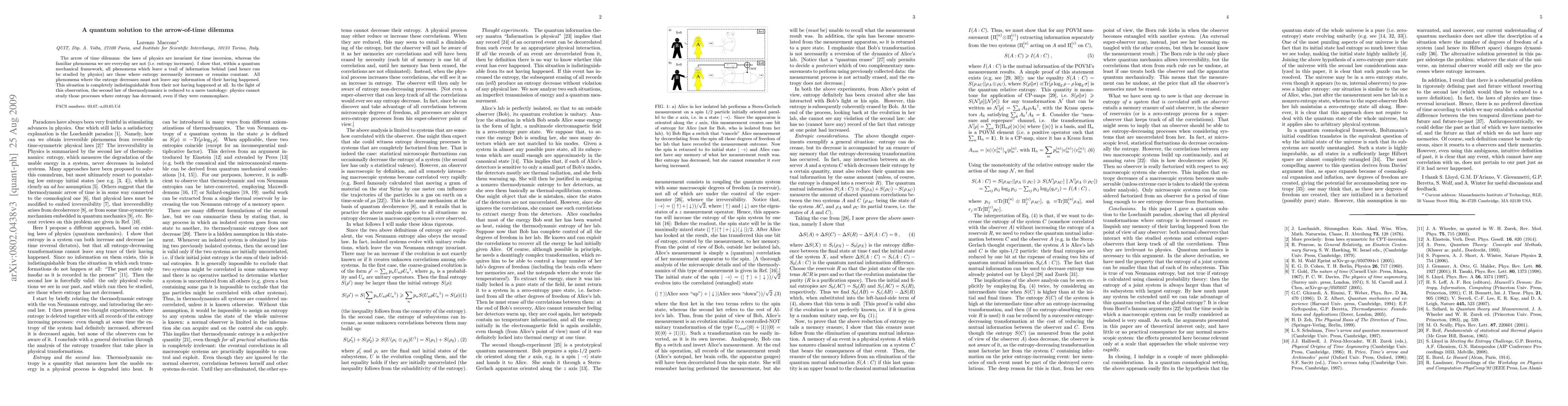 The paper proposes a quantum mechanical resolution to the arrow-of-time problem, asserting that physics can only observe processes where entropy increases or stays constant. It suggests that processes decreasing entropy are indistinguishable from non-occurring events, thus reducing the second law of thermodynamics to a tautology.