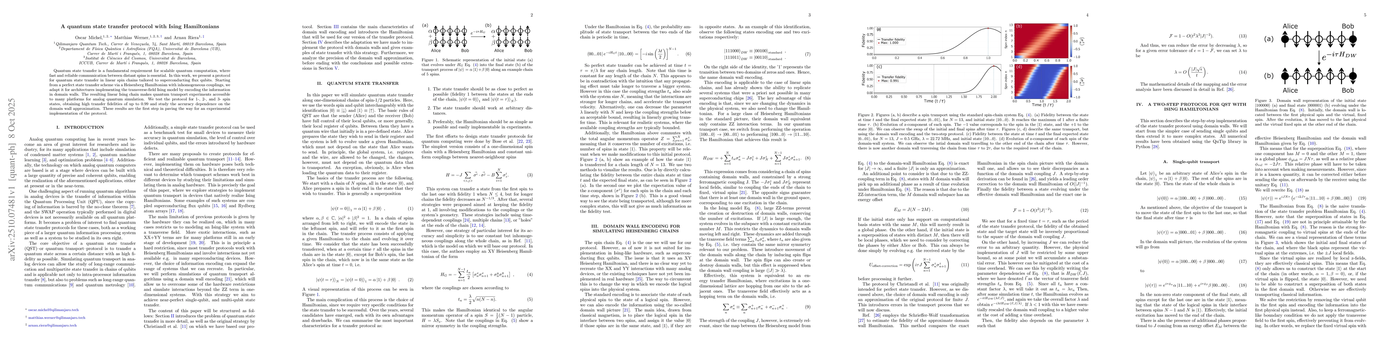 The research proposes a quantum state transfer protocol using Ising Hamiltonians, inspired by domain wall encoding. It leverages spin chains with Ising interactions to enable high-fidelity quantum information transfer between Alice and Bob. The protocol involves preparing domain wall states, evolving the system under specific Hamiltonians, and applying corrections to reset the chain post-transfer.