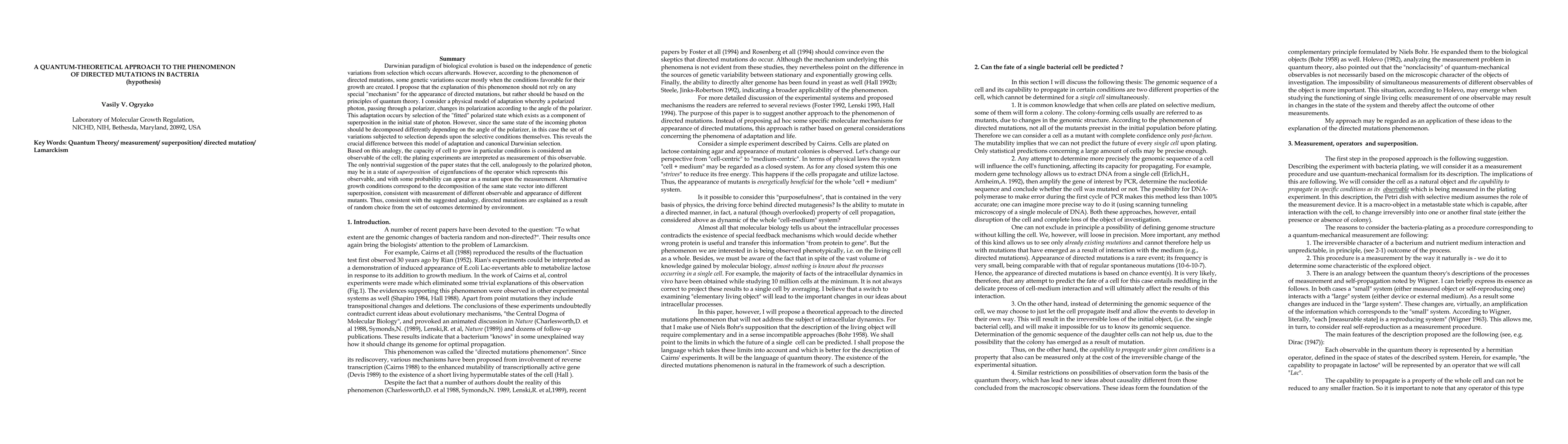 The Darwinian paradigm of biological evolution is based on the separability of the variation and selection processes. As a result, the population thinking had always been an integral part of the Darwinian approach. I propose an alternative scheme of biological adaptation. It is based on appreciation of limits of what we can observe considering an individual biological object. This leads to a possibility for the adaptation process to occur on the level of a single object, as a 'selection among virtual states of the organism'. I discuss the application of this idea to the phenomenon of adaptive mutations in bacteria.
