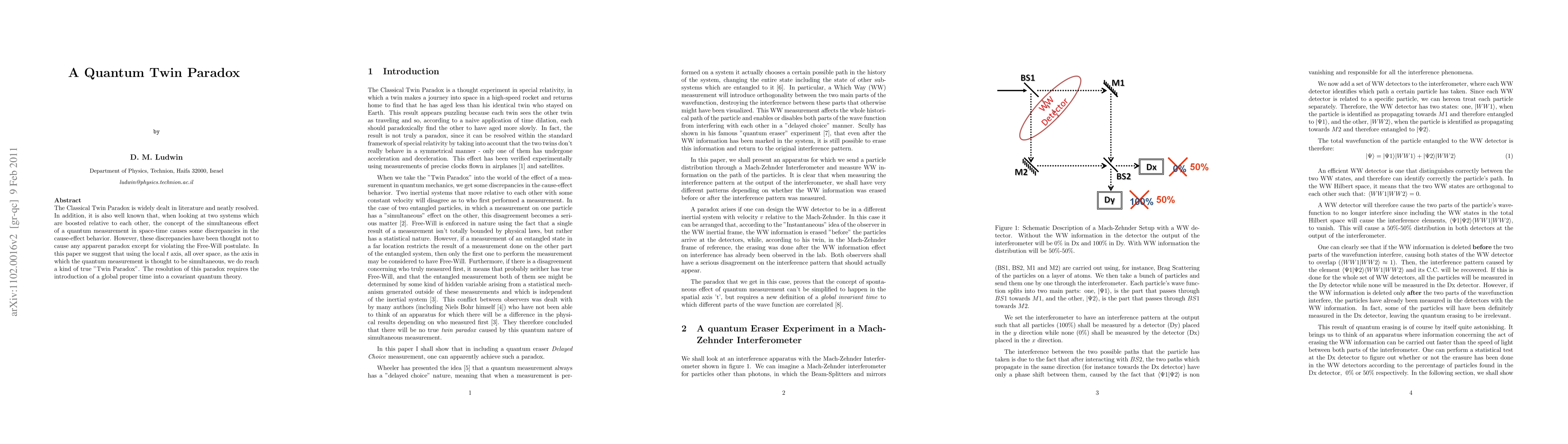 The Classical Twin Paradox is widely dealt in literature and neatly resolved. In addition, it is also well known that, when looking at two systems which are boosted relative to each other, the concept of the simultaneous effect of a quantum measurement in space-time causes some discrepancies in the cause-effect behavior. However, these discrepancies have been thought not to cause any apparent paradox except for violating the Free-Will postulate. In this paper we suggest that using the local t axis, all over space, as the axis in which the quantum measurement is thought to be simultaneous, we do reach a kind of true "Twin Paradox". The resolution of this paradox requires the introduction of a global proper time into a covariant quantum theory.