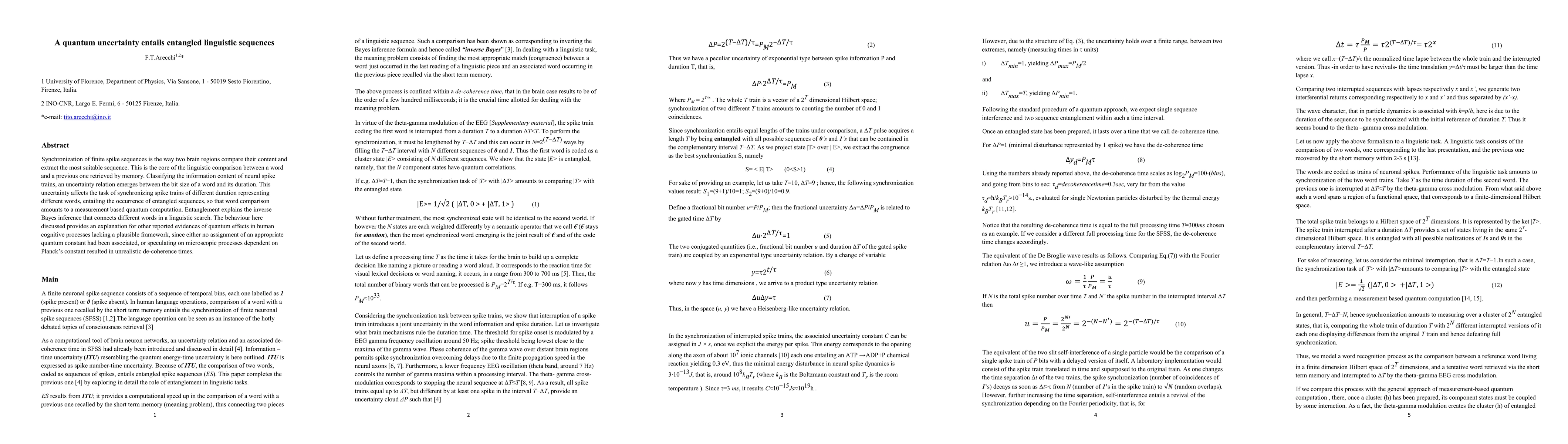 Synchronization of finite spike sequences is the way two brain regions compare their content and extract the most suitable sequence. This is the core of the linguistic comparison between a word and a previous one retrieved by memory. Classifying the information content of neural spike trains, an uncertainty relation emerges between the bit size of a word and its duration. This uncertainty affects the task of synchronizing spike trains of different duration representing different words, entailing the occurrence of entangled sequences, so that word comparison amounts to a measurement based quantum computation. Entanglement explains the inverse Bayes inference that connects different words in a linguistic search. The behaviour here discussed provides an explanation for other reported evidences of quantum effects in human cognitive processes lacking a plausible framework, since either no assignment of an appropriate quantum constant had been associated, or speculating on microscopic processes dependent on Planck's constant resulted in unrealistic de-coherence times.