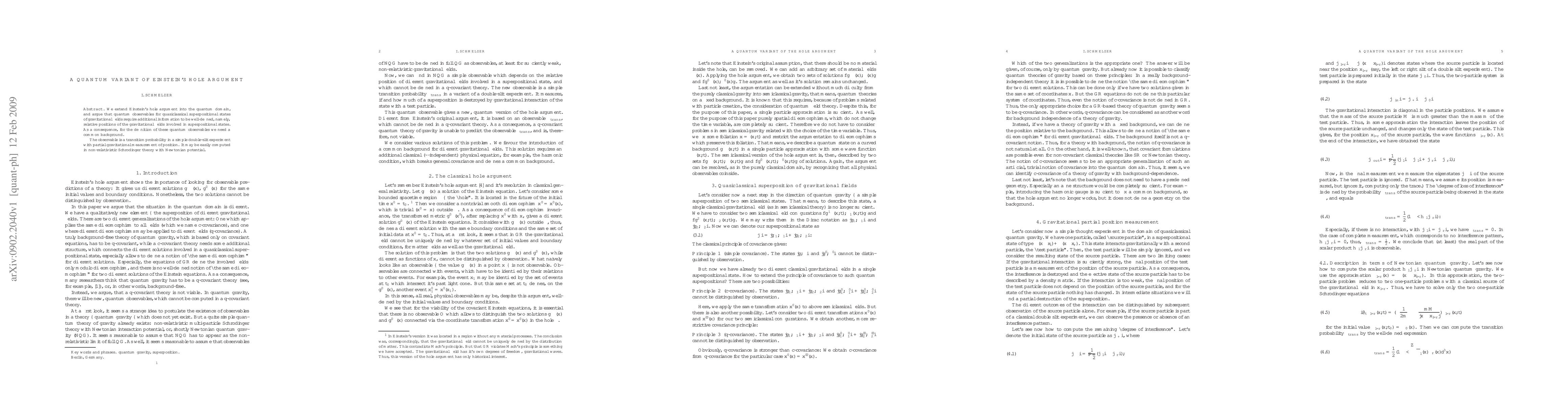 We extend Einstein's hole argument into the quantum domain, and argue that quantum observables for quasiclassical superpositional states of gravitational fields require additional information to be well-defined, namely, relative positions of the gravitational fields involved in superpositional states. As a consequence, for the definition of these quantum observables we need a common background. The observable is a transition probability in a simple double-slit experiment with partial gravitational measurement of position. It may be easily computed in non-relativistic Schroedinger theory with Newtonian potential.