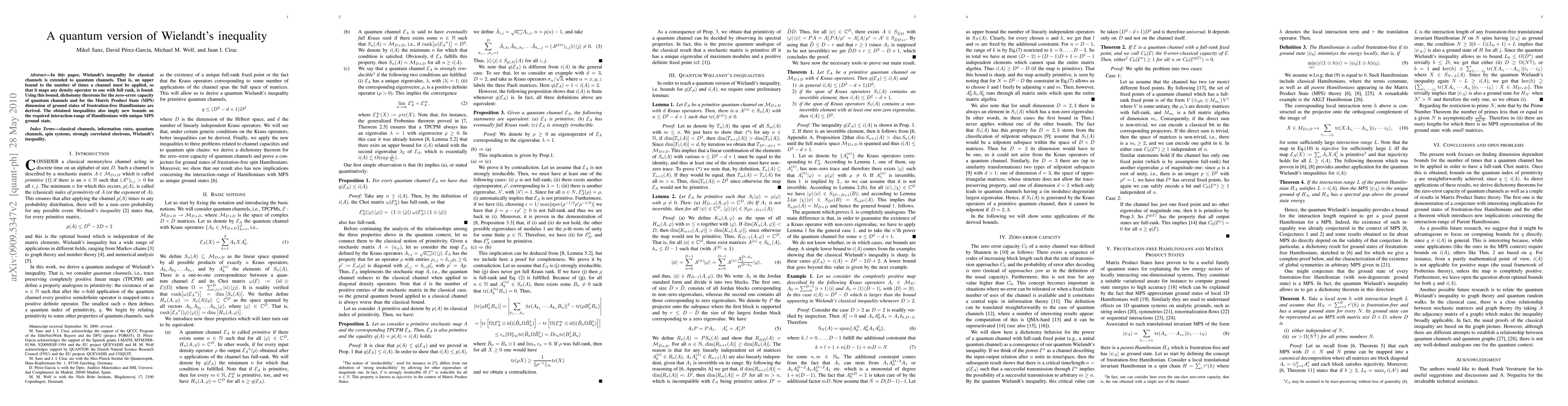This paper extends Wielandt's inequality from classical to quantum channels, establishing an upper bound on the number of times a quantum channel must be applied to map any density operator to one with full rank. The derived inequalities lead to new results on the zero-error capacity of quantum channels and the Matrix Product State dimension of frustration-free Hamiltonians.