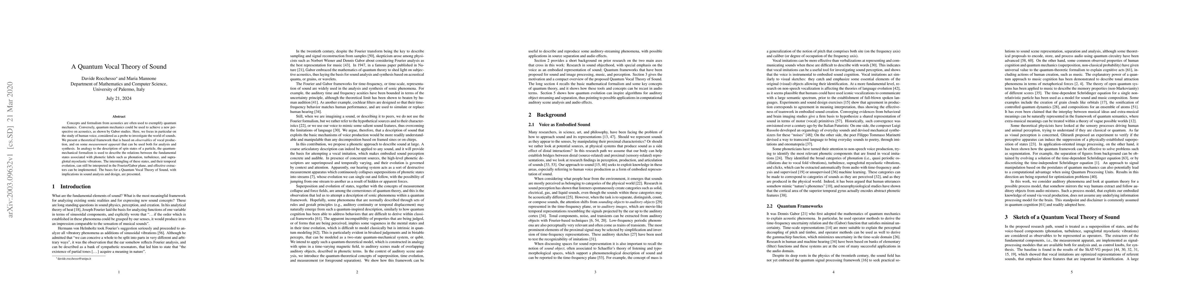 Concepts and formalism from acoustics are often used to exemplify quantum mechanics. Conversely, quantum mechanics could be used to achieve a new perspective on acoustics, as shown by Gabor studies. Here, we focus in particular on the study of human voice, considered as a probe to investigate the world of sounds. We present a theoretical framework that is based on observables of vocal production, and on some measurement apparati that can be used both for analysis and synthesis. In analogy to the description of spin states of a particle, the quantum-mechanical formalism is used to describe the relations between the fundamental states associated with phonetic labels such as phonation, turbulence, and supraglottal myoelastic vibrations. The intermingling of these states, and their temporal evolution, can still be interpreted in the Fourier/Gabor plane, and effective extractors can be implemented. The bases for a Quantum Vocal Theory of Sound, with implications in sound analysis and design, are presented.