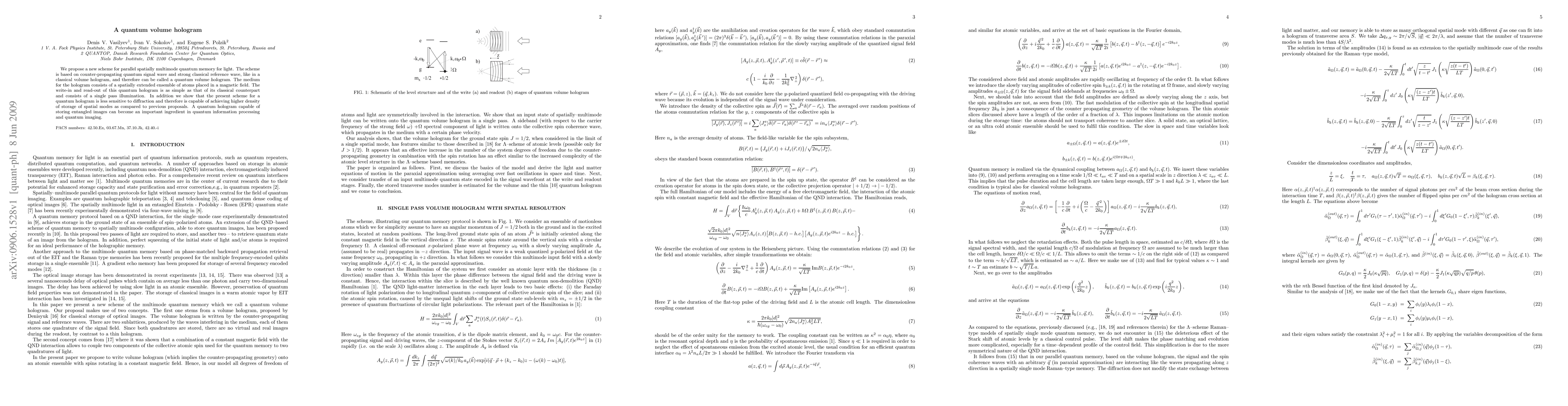 We propose a new scheme for parallel spatially multimode quantum memory for light. The scheme is based on counter-propagating quantum signal wave and strong classical reference wave, like in a classical volume hologram, and therefore can be called a quantum volume hologram. The medium for the hologram consists of a spatially extended ensemble of atoms placed in a magnetic field. The write-in and read-out of this quantum hologram is as simple as that of its classical counterpart and consists of a single pass illumination. In addition we show that the present scheme for a quantum hologram is less sensitive to diffraction and therefore is capable of achieving higher density of storage of spatial modes as compared to previous proposals. A quantum hologram capable of storing entangled images can become an important ingredient in quantum information processing and quantum imaging.