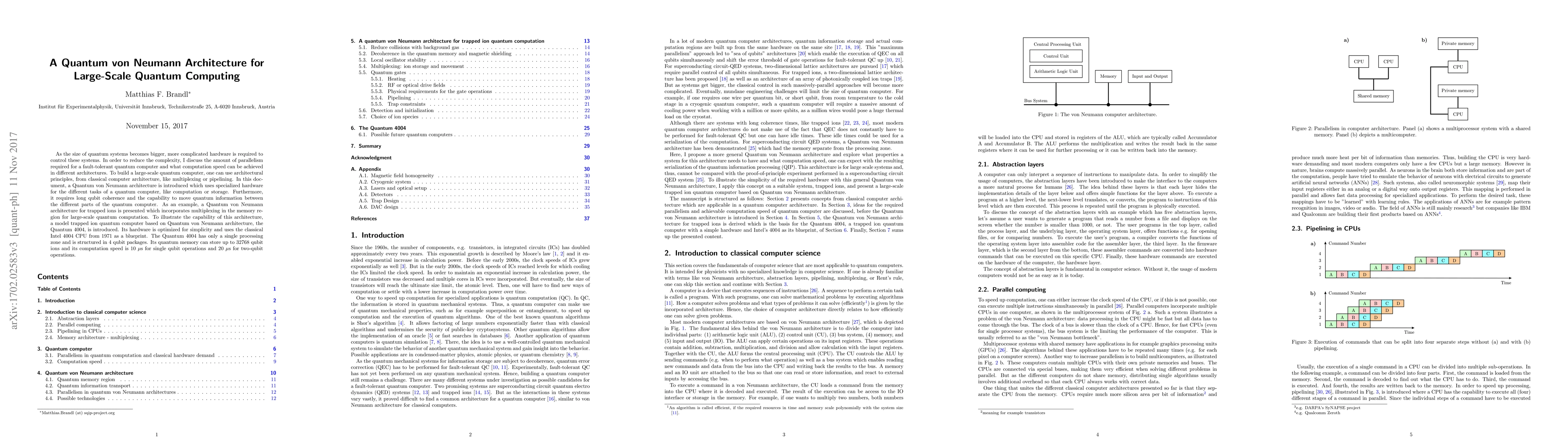 As the size of quantum systems becomes bigger, more complicated hardware is required to control these systems. In order to reduce the complexity, I discuss the amount of parallelism required for a fault-tolerant quantum computer and what computation speed can be achieved in different architectures. To build a large-scale quantum computer, one can use architectural principles, from classical computer architecture, like multiplexing or pipelining. In this document, a Quantum von Neumann architecture is introduced which uses specialized hardware for the different tasks of a quantum computer, like computation or storage. Furthermore, it requires long qubit coherence and the capability to move quantum information between the different parts of the quantum computer. As an example, a Quantum von Neumann architecture for trapped ions is presented which incorporates multiplexing in the memory region for large-scale quantum computation. To illustrate the capability of this architecture, a model trapped ion quantum computer based on Quantum von Neumann architecture, the Quantum 4004, is introduced. Its hardware is optimized for simplicity and uses the classical Intel 4004 CPU from 1971 as a blueprint. The Quantum 4004 has only a single processing zone and is structured in 4 qubit packages. Its quantum memory can store up to 32768 qubit ions and its computation speed is 10 $\mu$s for single qubit operations and 20 $\mu$s for two-qubit operations.