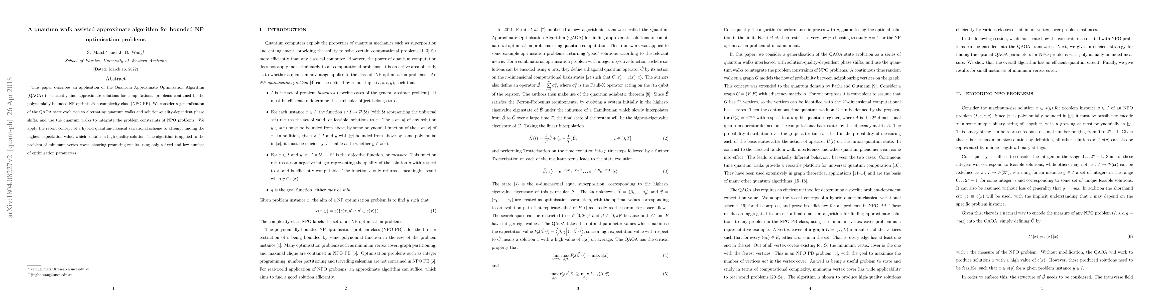 This paper proposes a quantum walk-assisted algorithm using the Quantum Approximate Optimisation Algorithm (QAOA) to find approximate solutions for bounded NP optimisation problems, demonstrating its effectiveness on the minimum vertex cover problem with a minimal number of parameters.