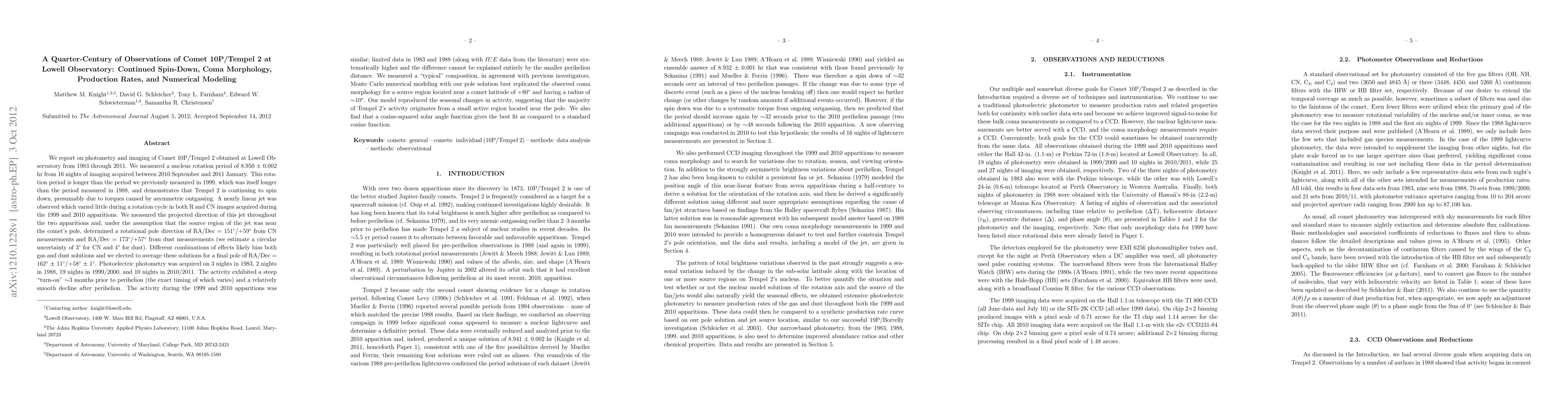 Over 25 years, Lowell Observatory tracked Comet 10P/Tempel 2, finding its rotation period lengthened from 1983 to 2011. A consistent, poleward jet was observed in R and CN images. Photometry revealed a steep activity increase before perihelion, smooth decline afterwards, and similar activity patterns in 1999 and 2010. Numerical modeling supports an active region near the comet's pole.