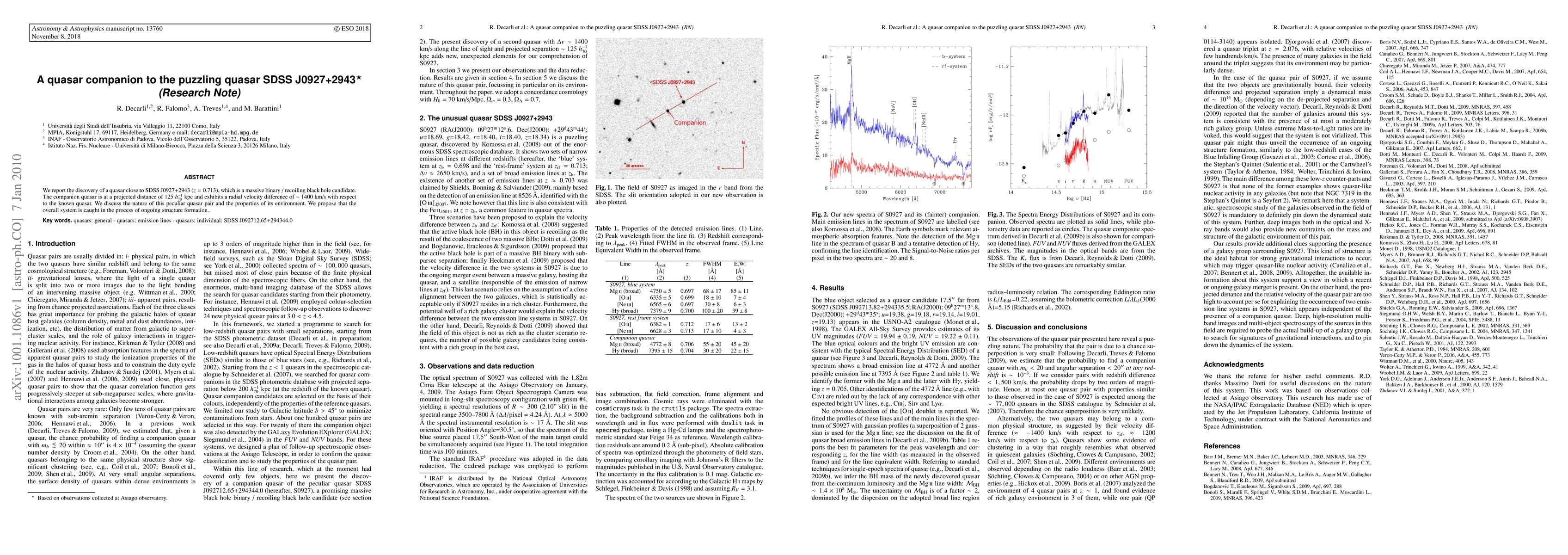 Scientists discovered a quasar companion to SDSS J0927+2943, a massive binary black hole candidate, with a radial velocity difference of ~1400 km/s. The discovery proposes the system is caught in ongoing structure formation.