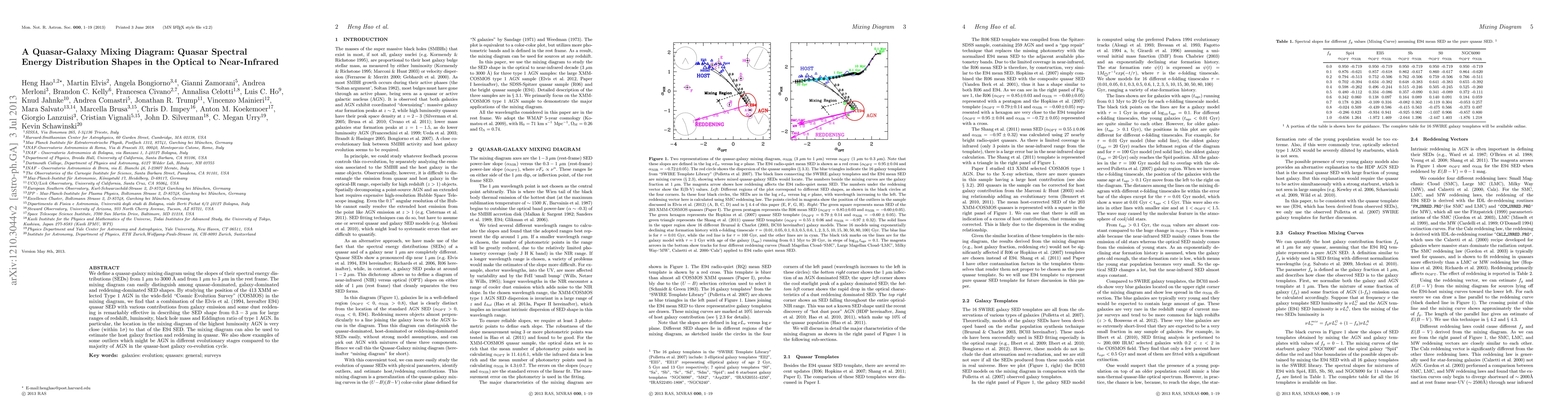 We define a quasar-galaxy mixing diagram using the slopes of their spectral energy distributions (SEDs) from 1\mu m to 3000\AA\ and from 1\mu m to 3\mu m in the rest frame. The mixing diagram can easily distinguish among quasar-dominated, galaxy-dominated and reddening-dominated SED shapes. By studying the position of the 413 XMM selected Type 1 AGN in the wide-field "Cosmic Evolution Survey" (COSMOS) in the mixing diagram, we find that a combination of the Elvis et al. (1994, hereafter E94) quasar SED with various contributions from galaxy emission and some dust reddening is remarkably effective in describing the SED shape from 0.3-3\mu m for large ranges of redshift, luminosity, black hole mass and Eddington ratio of type 1 AGN. In particular, the location in the mixing diagram of the highest luminosity AGN is very close (within 1\sigma) to that of the E94 SED. The mixing diagram can also be used to estimate the host galaxy fraction and reddening in quasar. We also show examples of some outliers which might be AGN in different evolutionary stages compared to the majority of AGN in the quasar-host galaxy co-evolution cycle.