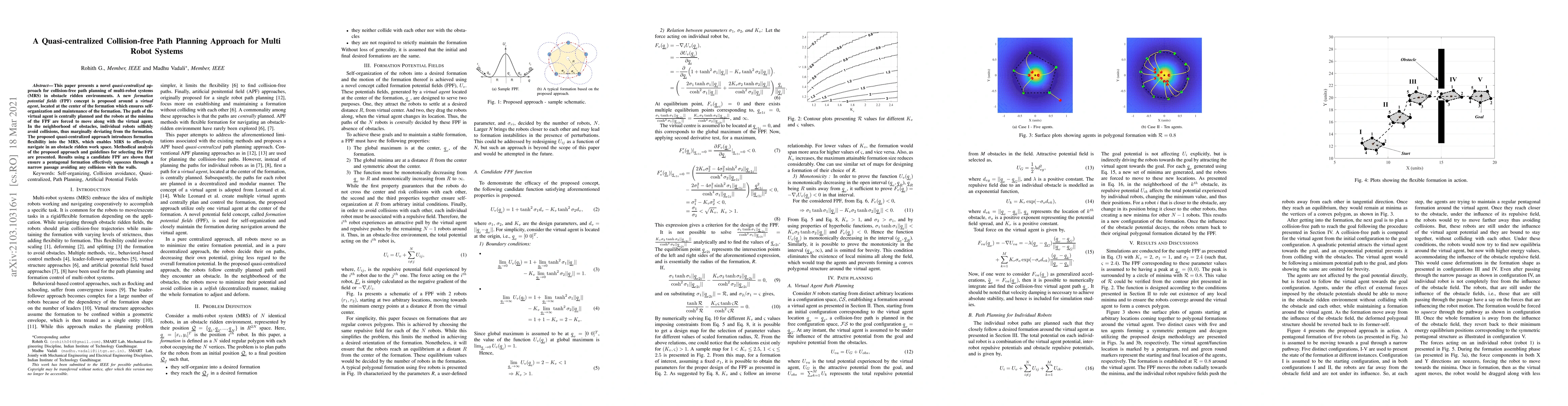 This paper introduces a quasi-centralized method for multi-robot path planning, using a formation potential fields approach. Robots maintain formation around a virtual agent's path, while individually avoiding obstacles, enabling efficient navigation in complex environments.