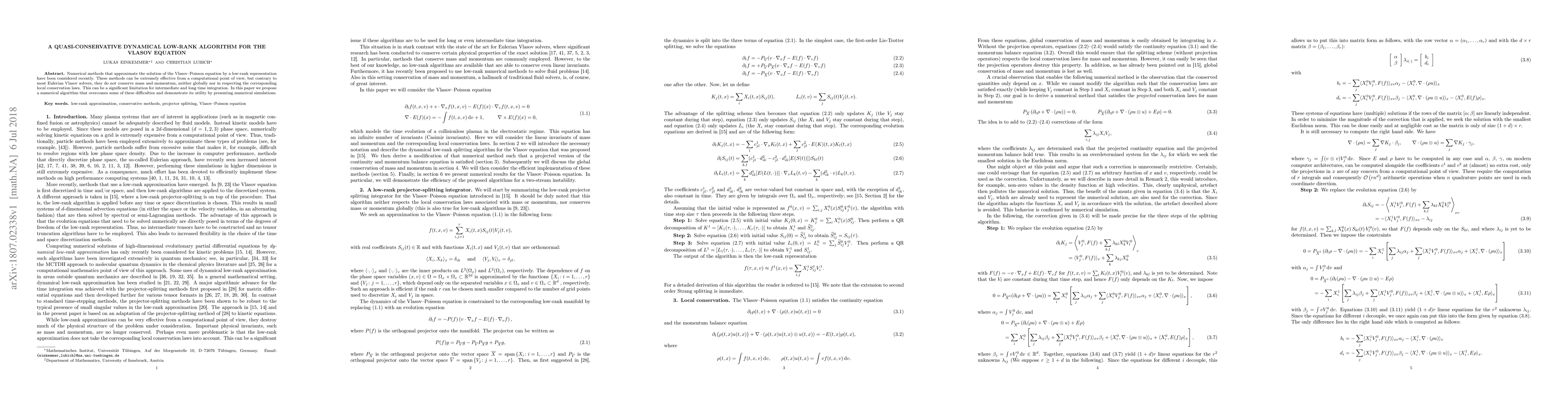 This paper introduces a quasi-conservative low-rank dynamical algorithm for solving the Vlasov-Poisson equation, addressing the limitations of previous low-rank methods that fail to conserve mass and momentum. The proposed method demonstrates improved conservation properties through numerical simulations.
