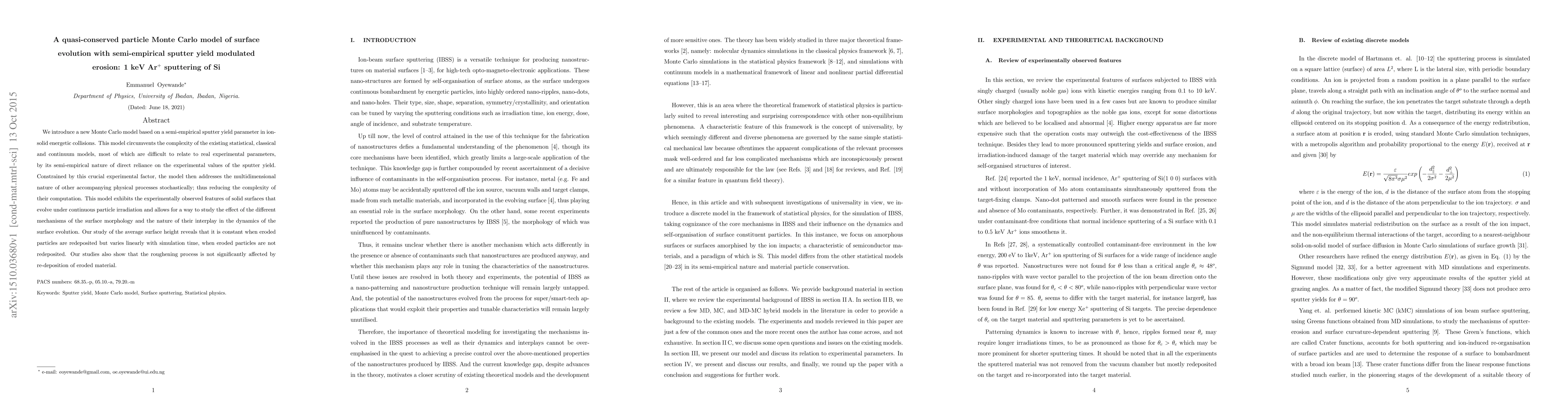 This paper presents a quasi-conserved particle Monte Carlo model for surface evolution under ion-solid collisions, using a semi-empirical approach to modulate sputter yield. The model effectively captures experimental observations and the dynamics of surface morphology, showing constant average surface height with redeposited particles and linear variation without re-deposition.